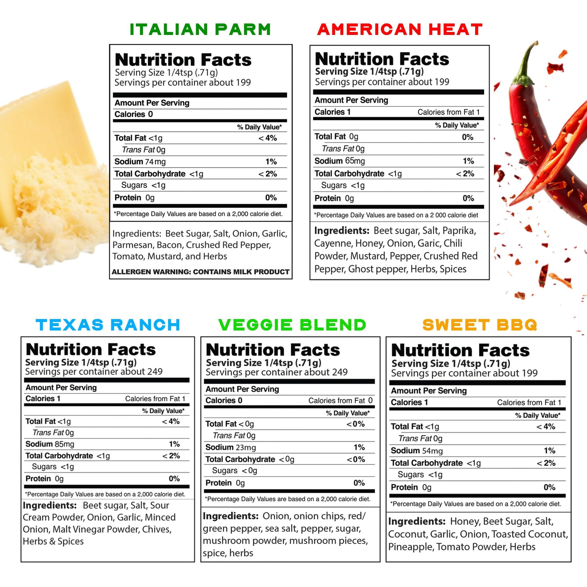 Key Features:- Includes five distinct flavors: American Heat (5oz), Veggie Blend (6.25oz), Sweet BBQ (5oz), Texas Ranch (6.25oz), and Italian Parmesan (6.25oz).