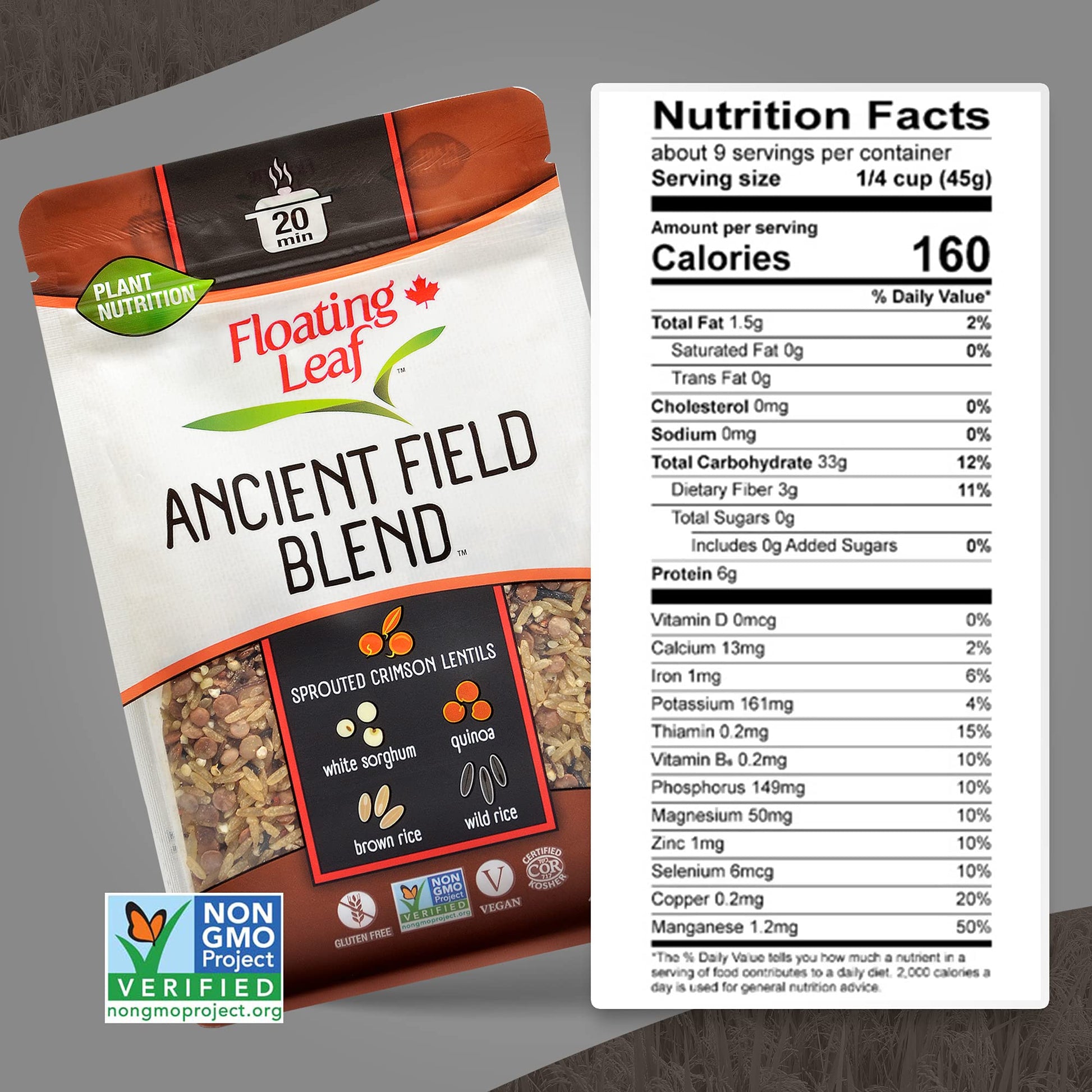 1 Pack x 14 ounces Ancient Field Blend, Wild Rice Blend with Sprouted Crimson Lentils, White Sorghum Grain, Quinoa and Brown Rice, Non Gluten, Non-Gmo, Kosher and Vegan - Floating Leaf