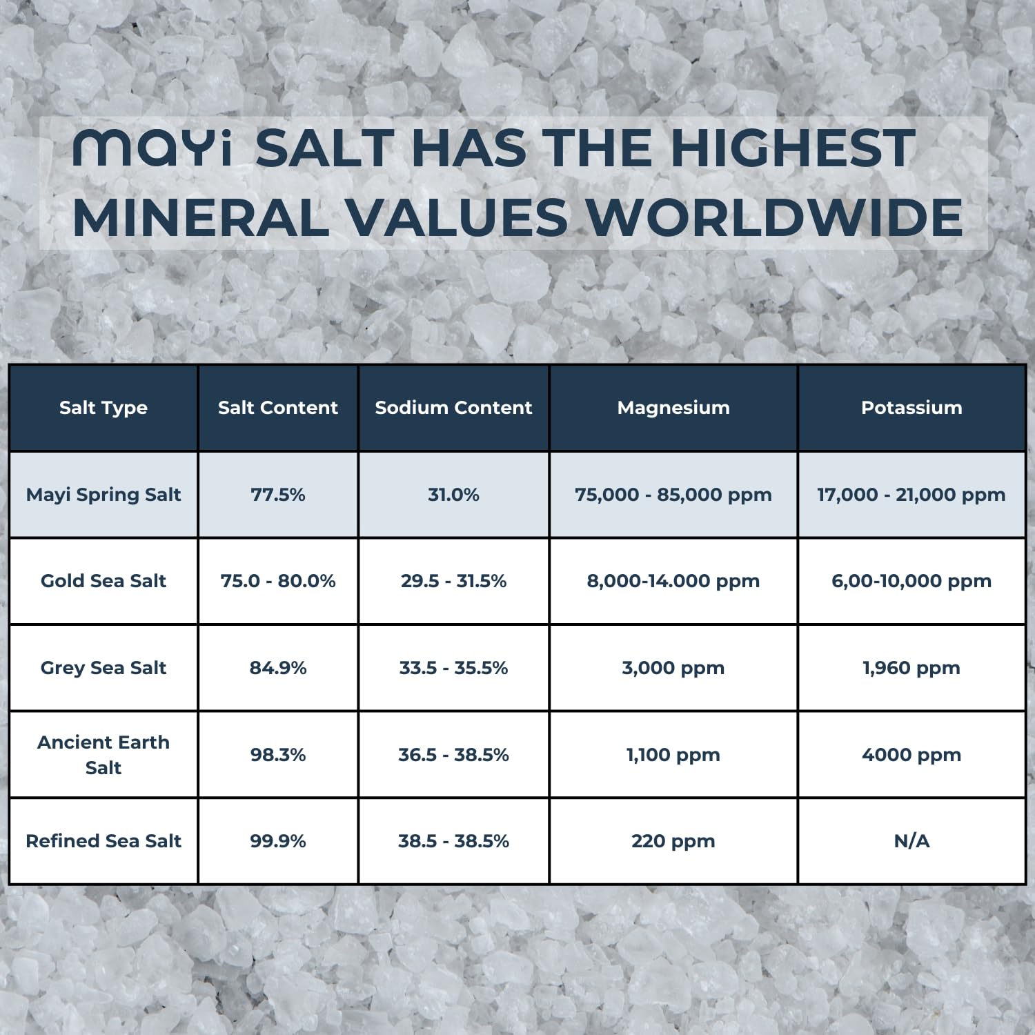 - Q: What sets Mayi Natural Liquid Spring Salt apart from other salts? A: Unlike sea and lake salts, Mayi Natural Liquid Spring Salt is extracted from underground sources in liquid form, ensuring it remains free from environmental pollution and factory waste. This process preserves its high mineral content and makes it one of the purest salts available.