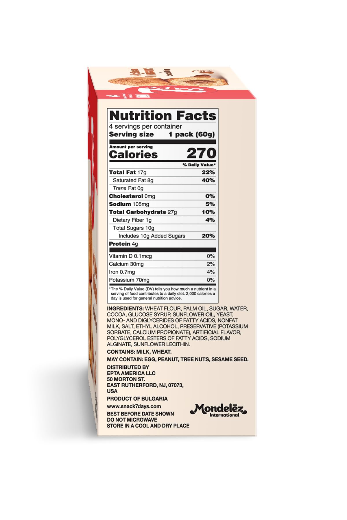 - Q: What are the ingredients in 7Days Chocolate Soft Croissants? A: 7Days Chocolate Soft Croissants are made with high-quality ingredients, including flour, chocolate filling, and other natural components. Notably, these croissants are Non-GMO, ensuring that they do not contain genetically modified organisms.