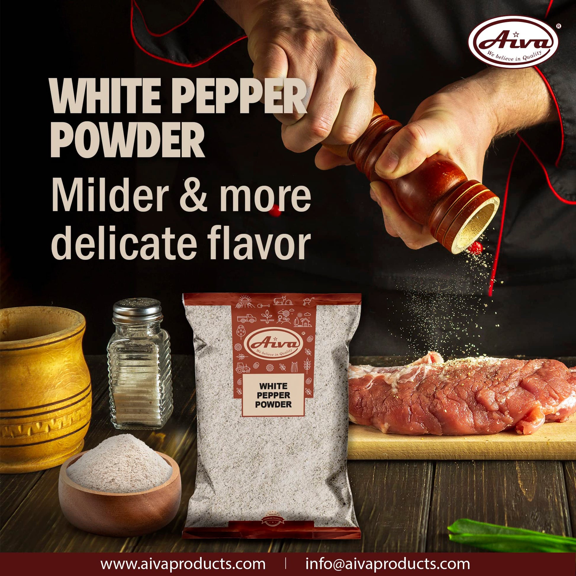 Q: What is Aiva Ground White Pepper Powder made from?A: Aiva Ground White Pepper Powder is made from carefully selected A-Grade white peppercorns, providing a mild and distinctive earthy flavor ideal for a variety of culinary uses.