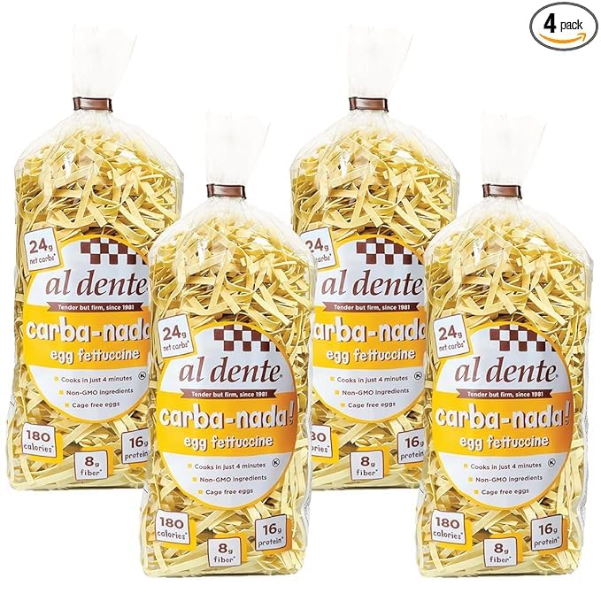- Q: What are the nutritional benefits of AL DENTE Carba-Nada Egg Fettuccine? A: AL DENTE Carba-Nada Egg Fettuccine is a great choice for those following a low-carb diet. Each serving contains only 24g net carbs, 180 calories, and a high protein content of 16g, along with 8g of fiber, making it a nutritious option that supports a fit and healthy lifestyle.