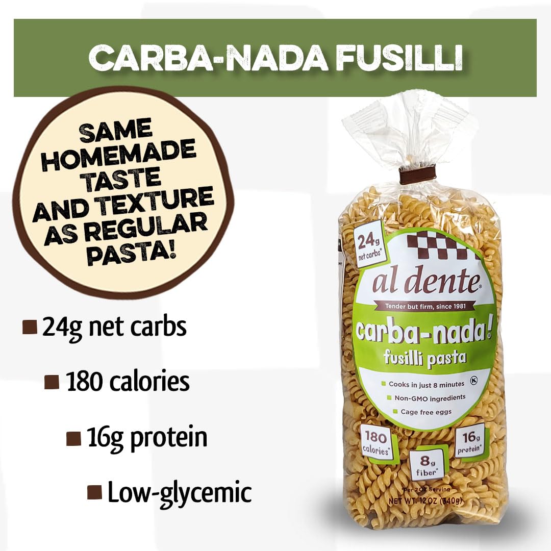 - Q: What are the nutritional benefits of Al Dente Carba-Nada Fusilli? A: Al Dente Carba-Nada Fusilli is a low-carb pasta option, containing only 24g net carbs per serving. It is also high in protein with 16g per serving and provides 8g of fiber, making it a nutritious choice for those following a fit and healthy lifestyle.