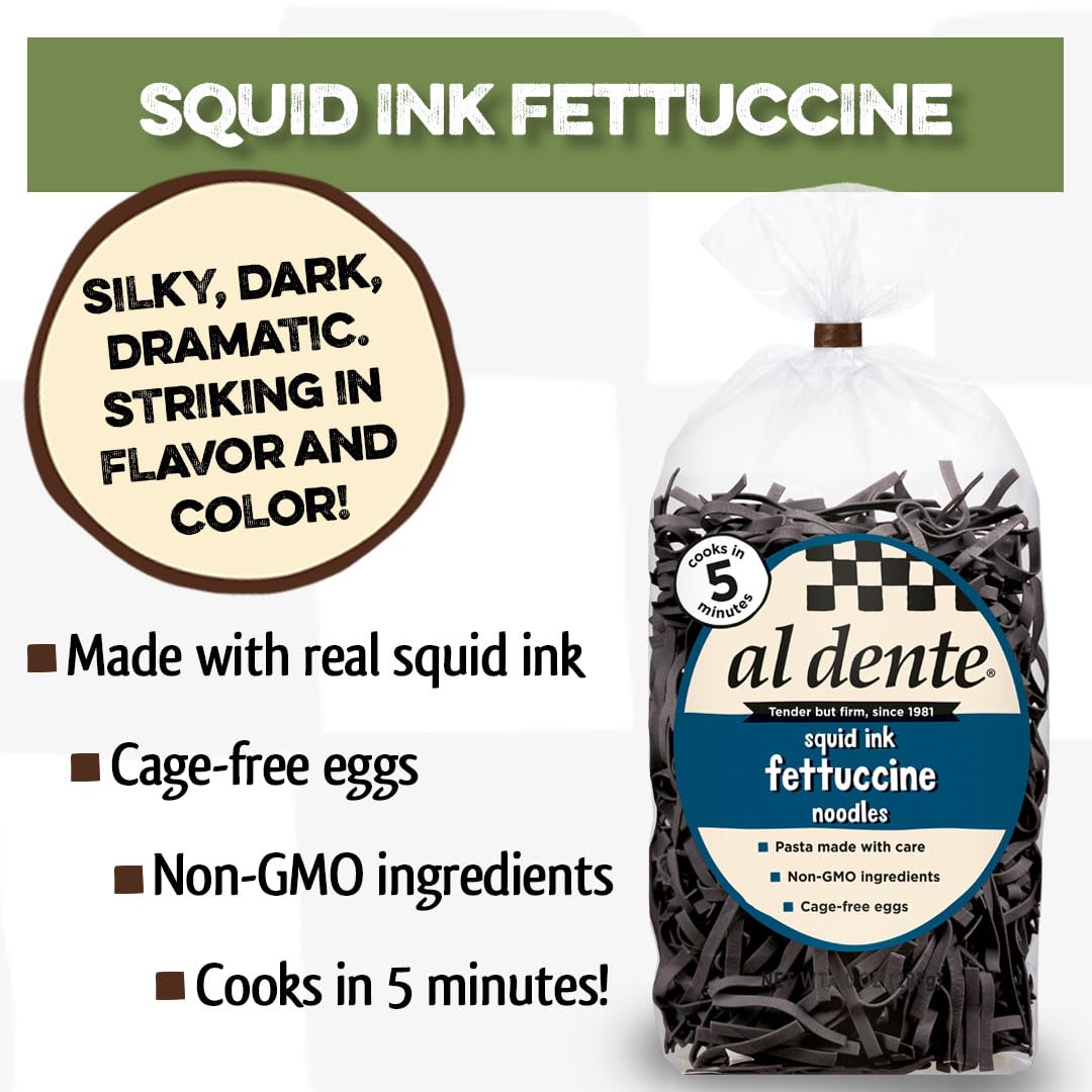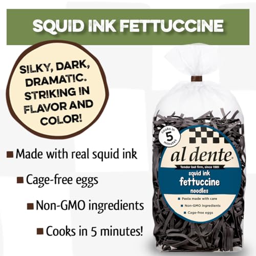 - Q: What are the main ingredients in Al Dente Squid Ink Fettuccine? A: Al Dente Squid Ink Fettuccine is made from enriched semolina, durum-wheat flours, whole eggs, and flavored with black squid ink. This combination gives the pasta its unique color and homemade texture.