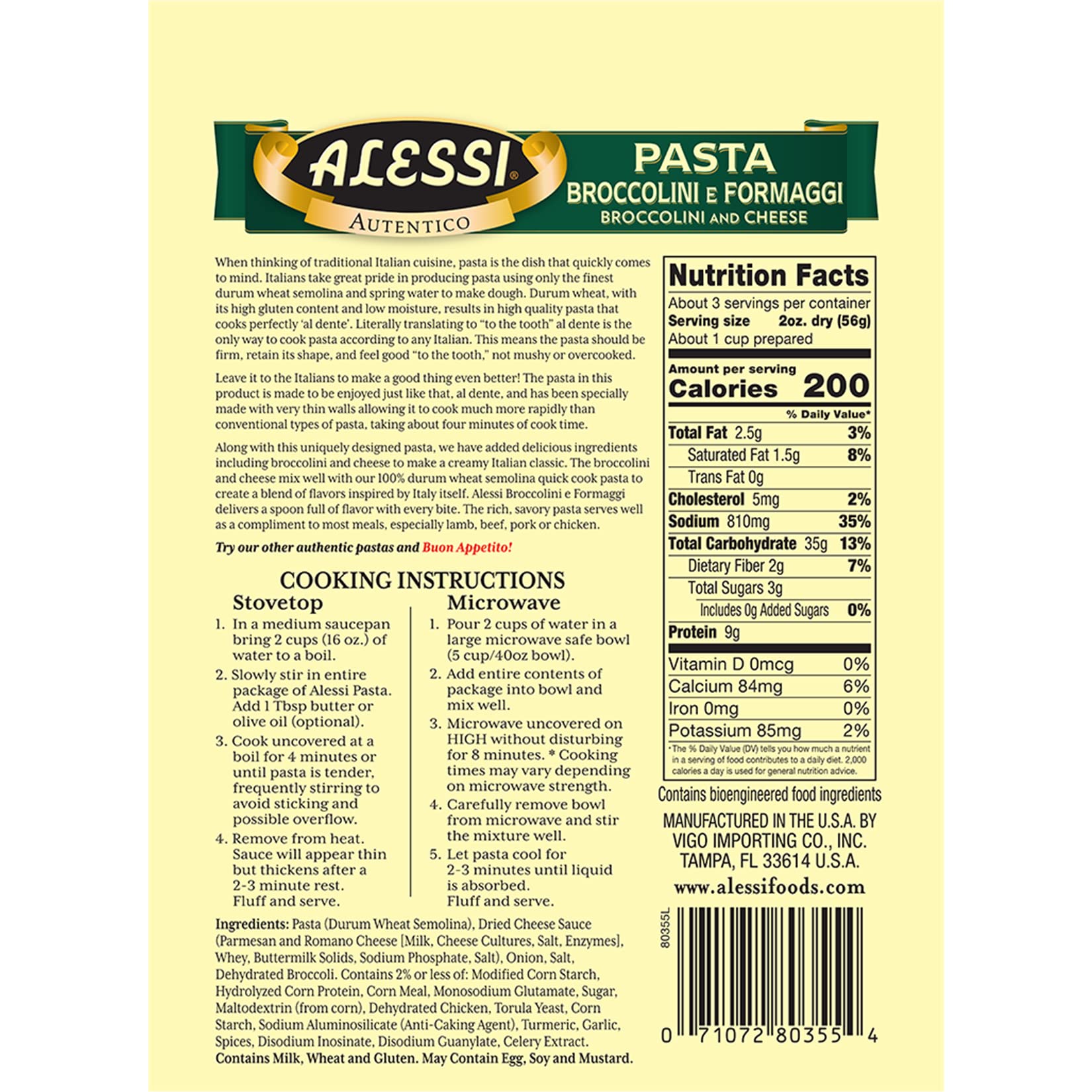 - Q: What dishes pair well with Alessi Broccolini & Cheese Pasta? A: Alessi Broccolini & Cheese Pasta pairs beautifully with a variety of proteins, including lamb, beef, pork, and chicken. Its rich, creamy flavor enhances any main dish.