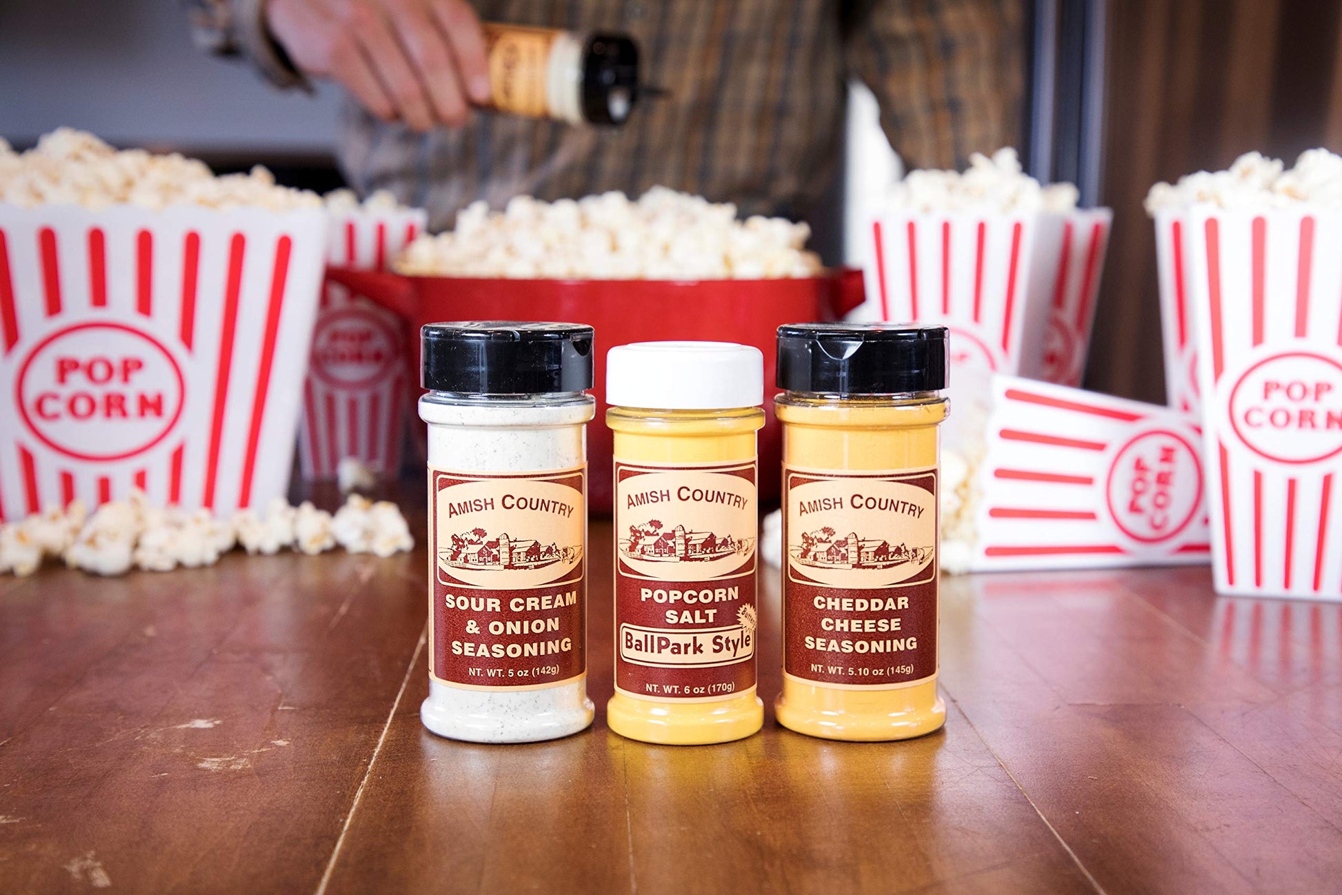 Q: What flavors are included in the Amish Country Popcorn Seasoning Variety Pack?A: The Amish Country Popcorn Seasoning Variety Pack includes three delicious flavors: 6 ounces of BallPark Style ButterSalt, 5.1 ounces of Cheddar Cheese, and 5 ounces of Sour Cream and Onion seasoning.