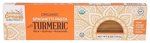 - Q: How do I cook Andean Dream Organic Spaghetti with Turmeric? A: To cook Andean Dream Organic Spaghetti with Turmeric, boil water in a pot, add a pinch of salt, and cook the spaghetti for about 8-10 minutes or until al dente. Drain and serve with your favorite sauce or toppings.