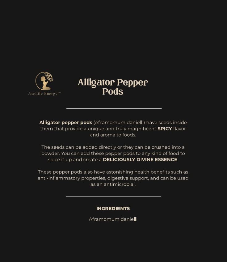 Enhance your culinary creations with AseLife Energy Alligator Pepper Pods. These unique pods, derived from the Aframomum danielli plant, are renowned for their exceptional spicy flavor and aromatic profile, making them an excellent addition to a variety of dishes.