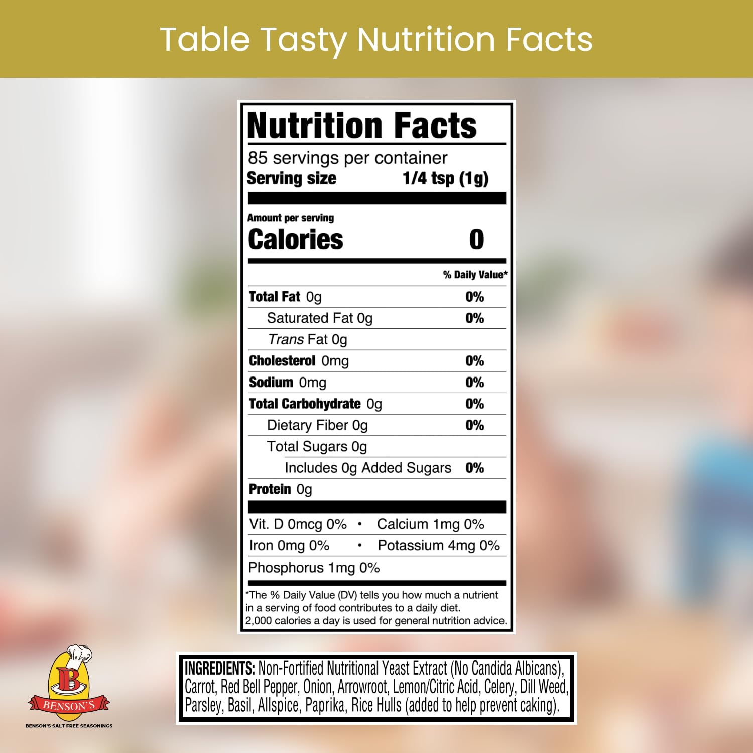 - Guilt-Free Alternative: Benson's Table Tasty Salt Substitute is rich in flavor and made from all-natural ingredients. It contains no sodium or potassium chloride, making it a healthy choice for those missing that essential salty kick in their food or snacks.