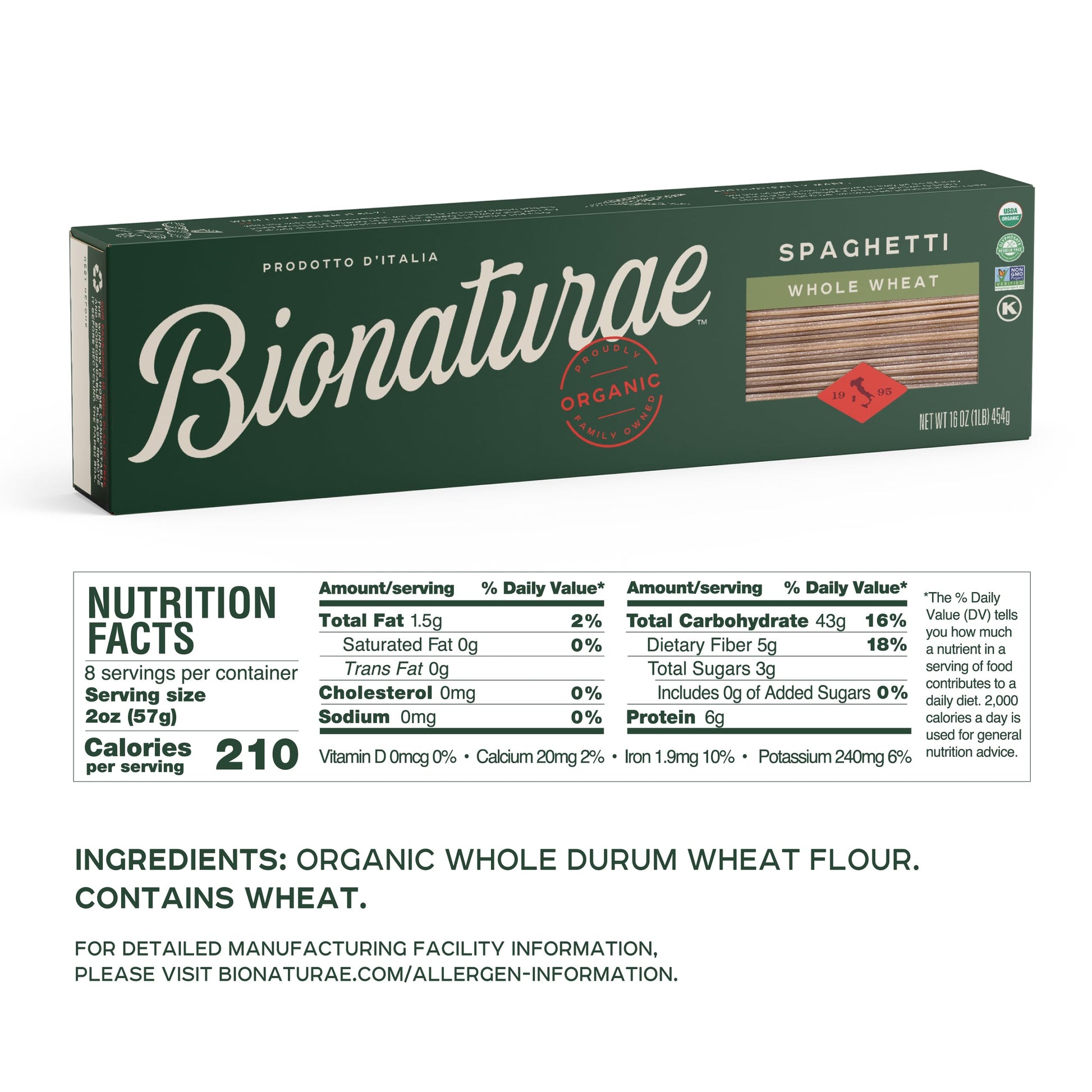 Bionaturae Spaghetti Pasta Noodles - Whole Wheat Pasta, Kosher Certified, High Protein, Non-Gmo, Usda Certified, Whole Wheat Spa