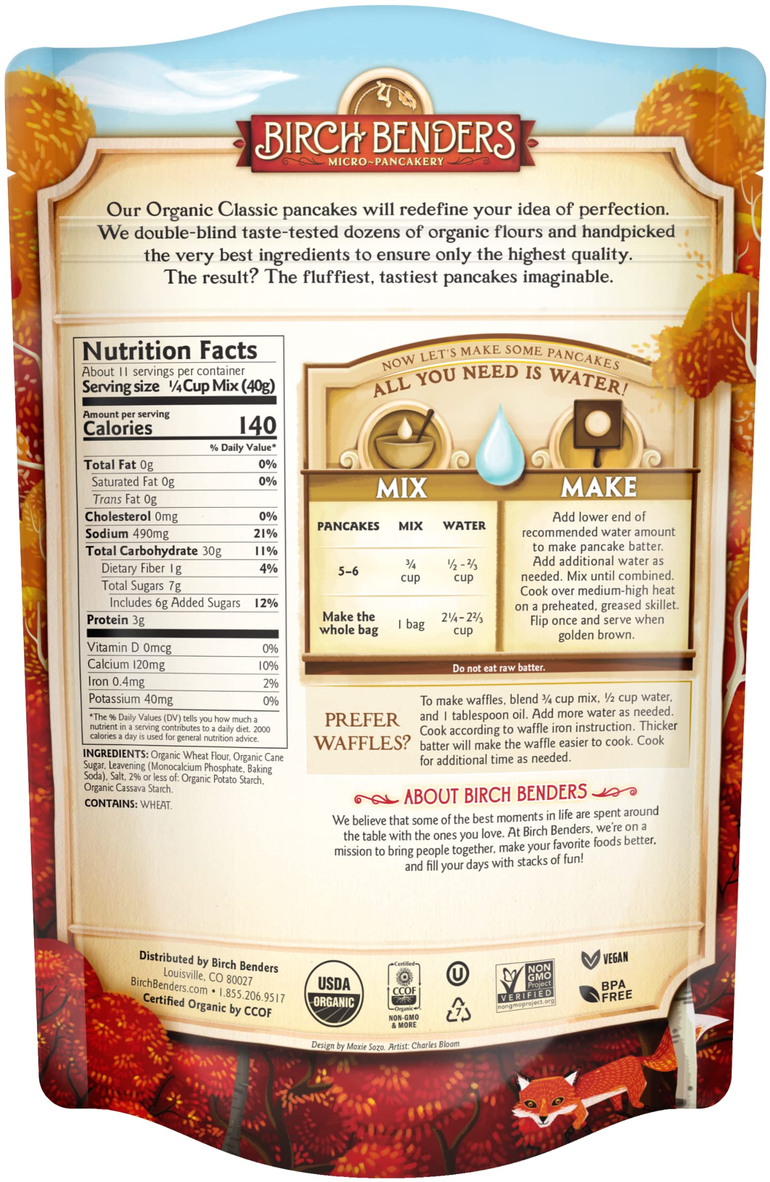 - Q: What is Birch Benders Pancake and Waffle Mix made of? A: Birch Benders Pancake and Waffle Mix is made from organic ingredients that are Non-GMO, USDA Organic, and vegan. It is free from cholesterol, dairy, and fat, making it a wholesome choice for breakfast.