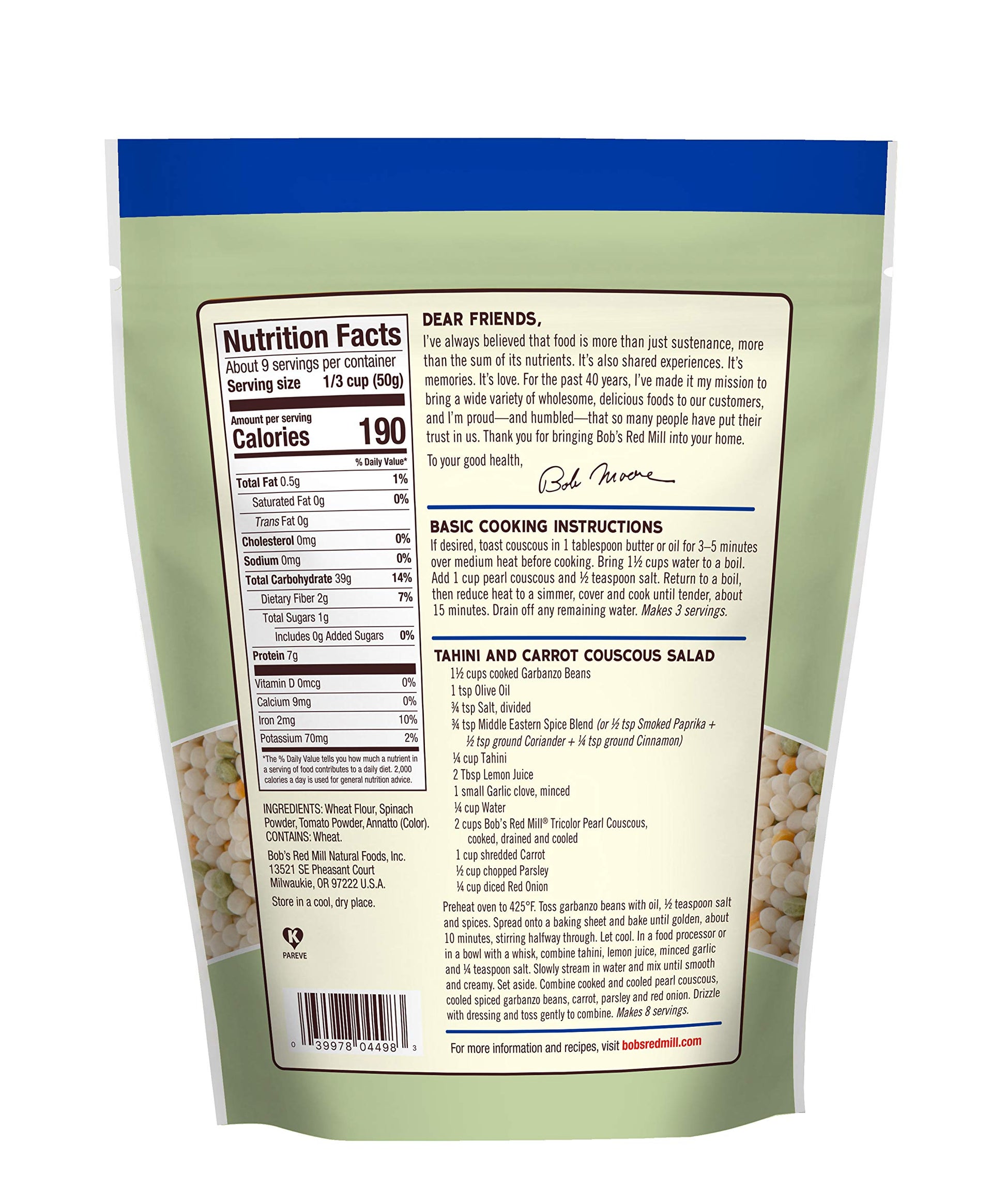 - Q: What are some recipes I can make with Bob's Red Mill Pearl Couscous? A: You can use Bob's Red Mill Pearl Couscous in a variety of recipes, including as a bed for stews, mixed with your favorite pasta sauce, or added to soups and pilafs. Its unique texture and flavor make it a fantastic addition to many dishes.