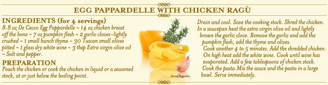 - Q: Can I store leftover cooked De Cecco Egg Pappardelle, and if so, how? A: Yes, you can store leftover cooked De Cecco Egg Pappardelle in an airtight container in the refrigerator for up to 3 days. To reheat, simply add a splash of water and microwave or gently heat on the stove to preserve its texture.