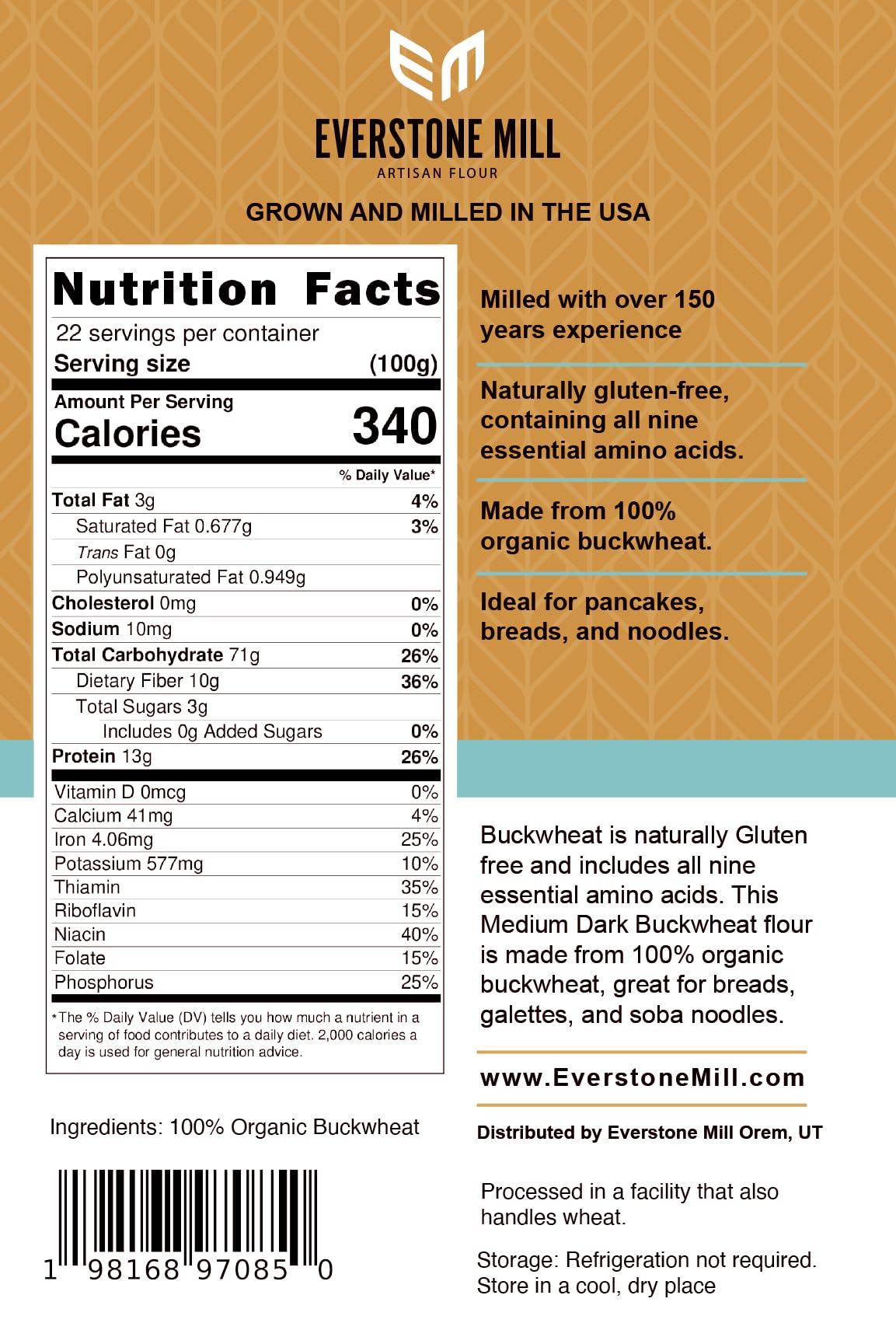 Everstone Mills buckwheat flour is milled at a historic mill with 150 years of experience. It is available in two varieties: Light and Medium Dark. The Light flour is made from hulled buckwheat groats, resulting in a light and airy texture, ideal for pancakes, breads, and waffles. The Medium Dark flour, composed of 80% unhulled and 20% hulled buckwheat, offers a richer flavor, perfect for traditional French galettes and Japanese soba noodles. This flour is not only delicious but also packed with essential vitamins, minerals, and all nine essential amino acids, supporting overall well-being.