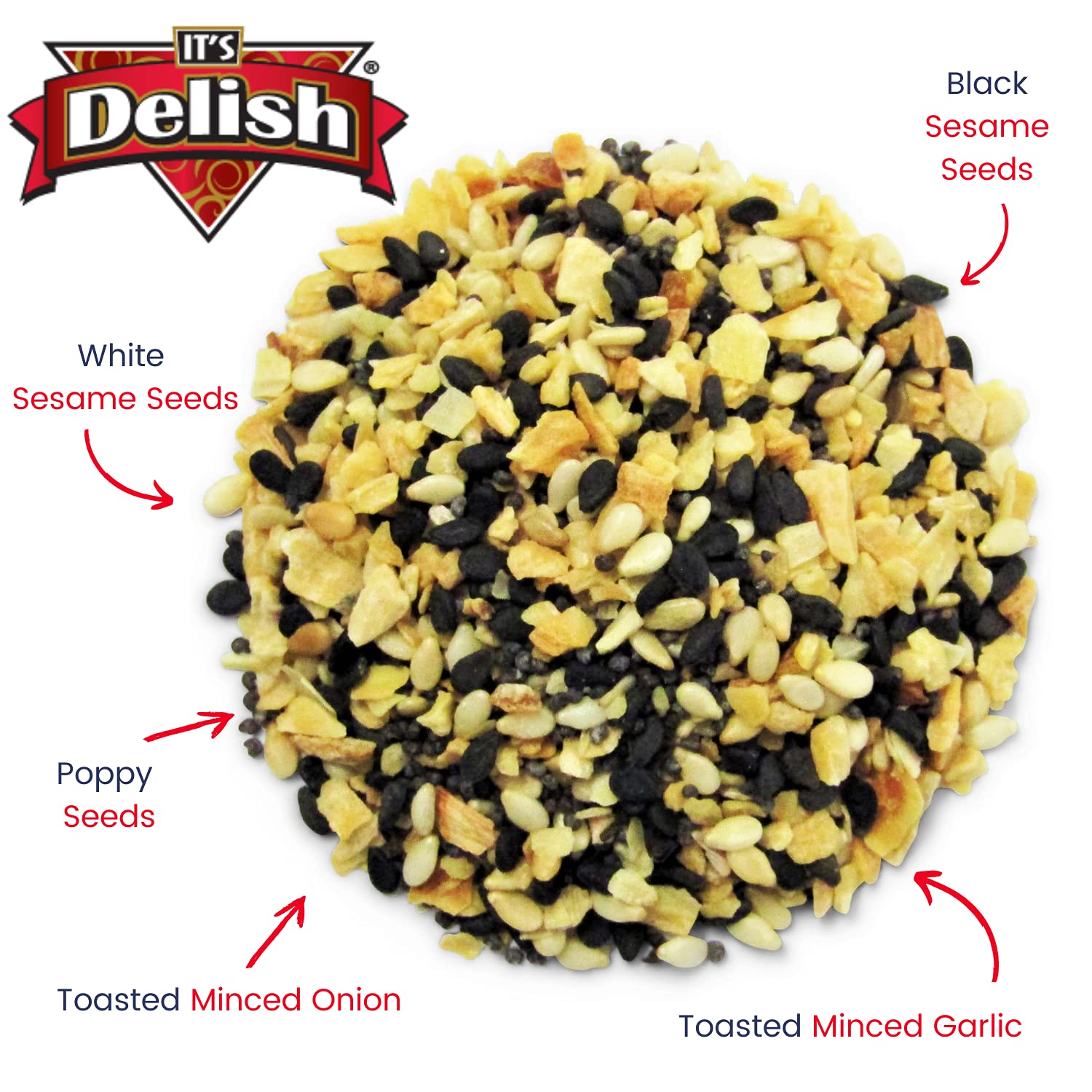Q: What are the main ingredients in the Everything Bagel Seasoning Blend?A: The Everything Bagel Seasoning Blend by It's Delish includes high-quality black sesame seeds, toasted minced garlic, poppy seeds, and white hulled sesame seeds, all without added salt.