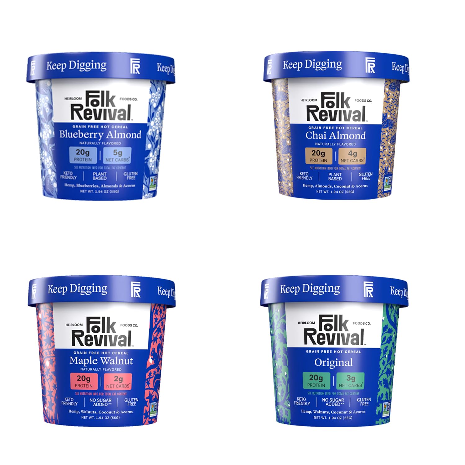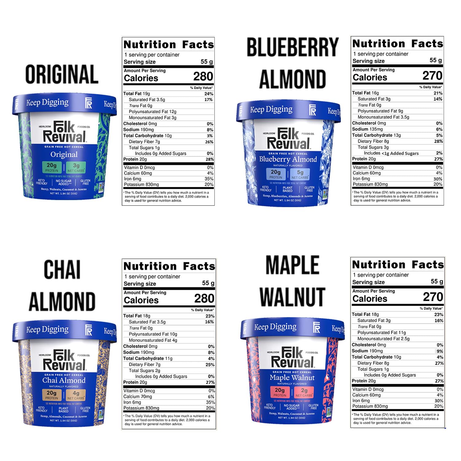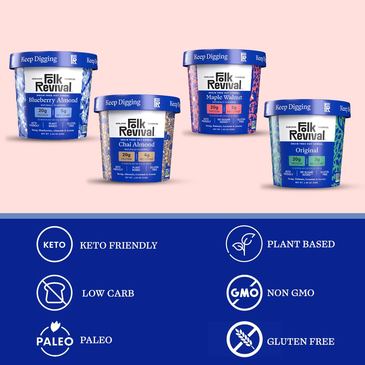 - Q: What are the main ingredients in Folk Revival Keto Instant Oatmeal? A: Folk Revival Keto Instant Oatmeal contains a blend of nutritious ingredients including hemp protein powder, shelled hemp seeds, walnuts, pumpkin seeds, flax seeds, organic coconut, chia seeds, acorn flour, chicory root fiber, sea salt, and monk fruit. Each flavor variant includes additional specific ingredients like wild blueberries in the Blueberry Almond flavor and chai spice in the Chai Almond flavor.