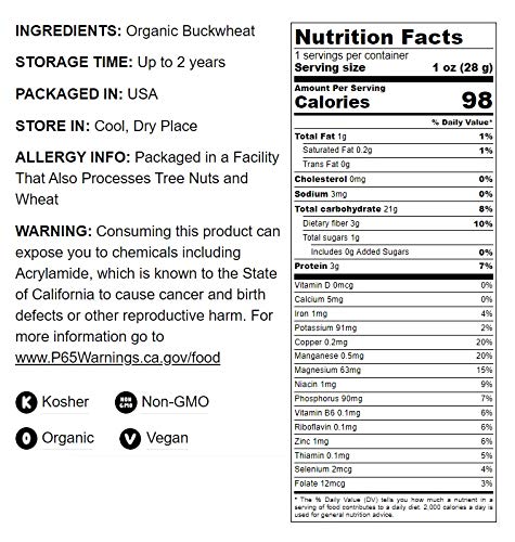 Organic buckwheat kernels are usually considered whole grains, but they are actually seeds. Organic kasha is actually hulled and roasted buckwheat kernels. The taste of organic buckwheat is rich, a little bit nutty. As it’s much more flavorful than many whole grains, you can use it as a substitute in recipes. The main organic buckwheat benefits come from the fact that it’s nutritious and low in calories. This combination makes it a perfect choice for a weight management diet. Many athletes also love organic kasha because it gives them protein and fiber without fat. Buckwheat nutrition value is rather high compared to whole grains. One cup of cooked organic kasha will provide you with: - B vitamins - Vitamin K - Vitamin E - Calcium - Manganese - Phosphorus - Magnesium - Zinc - Iron - Copper - Selenium One of the great things about organic buckwheat kernels is that you don’t have to pre-soak them before cooking. Of course, you can do this, but they soak up water so effectively that in a few hours groats will be all but cooked even before you turn on the heat. This will make them mushy by the time you are actually finished cooking. You can enjoy organic kasha in many ways. Use it as a breakfast cereal or as an ingredient in a delicious main dish, cooked pilaf-style. You can mill grains into buckwheat flour and enjoy making organic buckwheat crepes and pancakes. They taste incredible and are lower in calories than wheat products. Organic buckwheat kernels are also safe to use in any gluten-free baking project. WARNING: Consuming this product can expose you to chemicals including Acrylamide, which is known to the State of California to cause cancer and birth defects or other reproductive harm. For more information go to www.P65Warnings.ca.gov/food