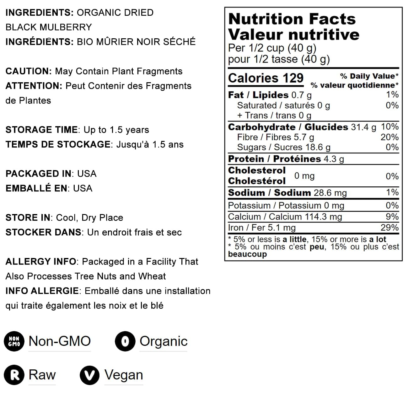 Organic & Non-Gmo: Dried Black Mulberries By Food To Live Are Organic And Non-Gmo Verified. They Are Raw And Vegan. It Contains No Sugar Or Any Other Additives. | Nutritional Booster Fruit: Organic Dried Black Mulberries Make A Rich Source Of Iron, Calcium, And Vitamin C. Besides, 1.4 Ounces Of Mulberries Contain About 4G Of Protein. | Antioxidant-Rich Candy Alternative: Organic Black Mulberries Are Sweet And Tangy And Taste Better Than Candy. They Are Also Packed With Powerful Antioxidants. | Great As A Snack & Ingredient: Organic Dried Unsweetened Black Mulberries Need No Additives As They Taste Amazing Right From The Pack. Add Them To Oatmeal, Desserts, Pastries, And Granola. | Long Shelf Life: Keep Your Sun-Dried Organic Black Mulberries Dry In An Airtight Container And You