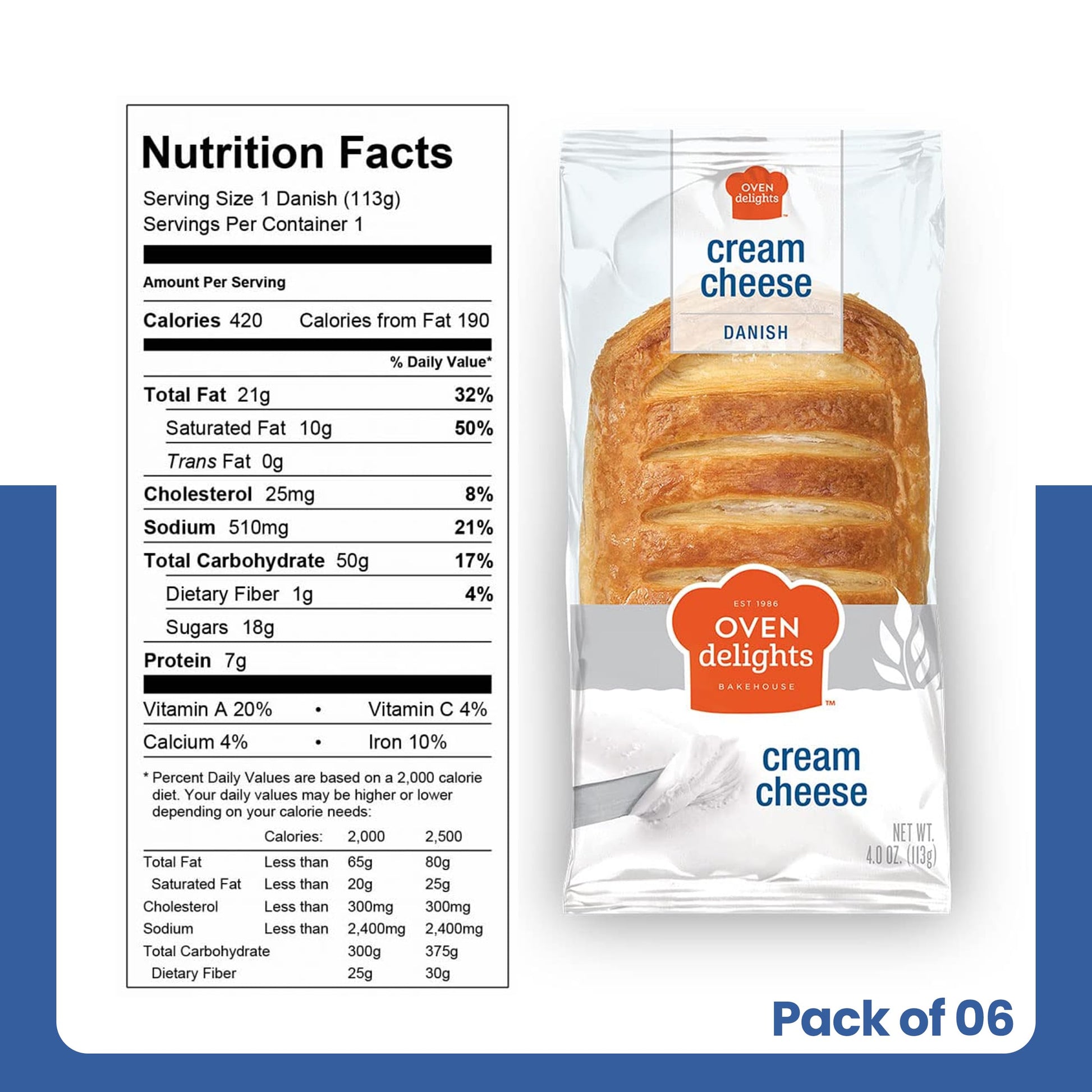 - Q: What is the packaging size for Oven Delights Cream Cheese Danish? A: Oven Delights Cream Cheese Danish comes packaged in a box of six, with each Danish being four ounces. This makes it convenient for home, office, or gatherings.