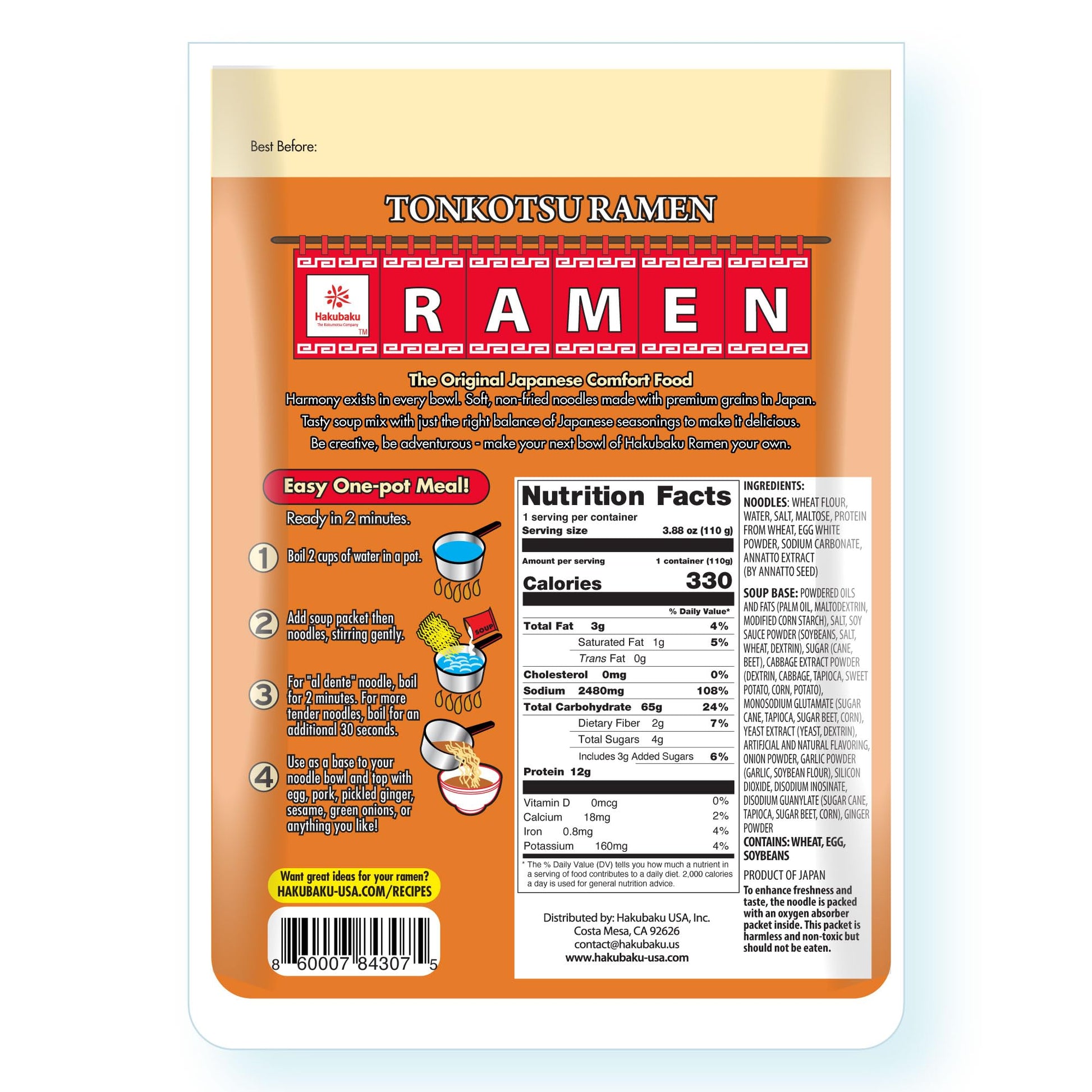 - Q: How do I prepare Hakubaku Tonkotsu ramen noodles? A: To prepare Hakubaku Tonkotsu ramen noodles, cook both the noodles and the savory Tonkotsu soup stock together in 2 cups of boiling water. For al dente noodles, boil for 2 minutes; for a more tender texture, boil for an additional 30 seconds. Add your favorite toppings and enjoy!