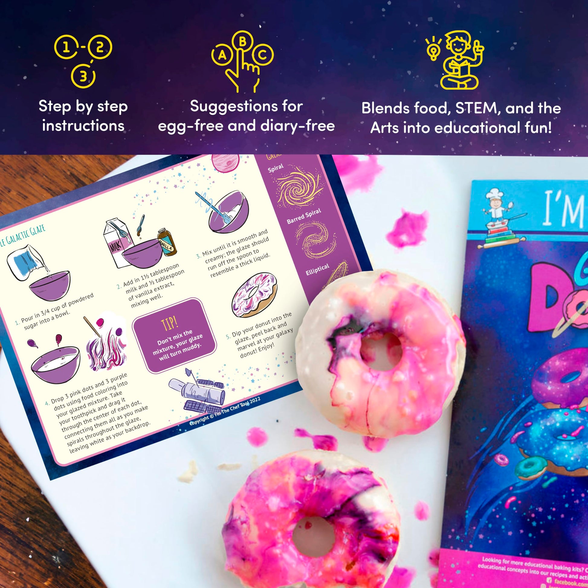 Q: How can this baking set help my child learn STEM concepts?A: This baking set incorporates STEM lessons by allowing kids to engage in hands-on activities related to science, technology, engineering, and math while they create delicious galaxy donuts.