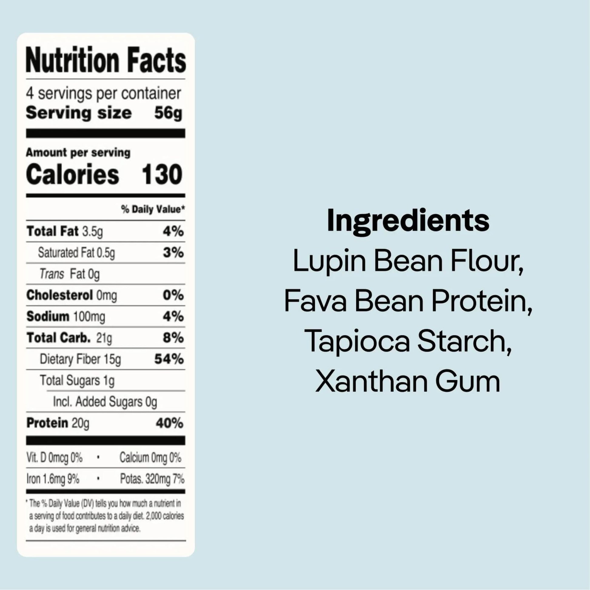 Q: What are the main ingredients in Kaizen Low Carb Keto Pasta?A: Kaizen Low Carb Keto Pasta is made primarily from high fiber lupin flour, derived from lupin beans, making it a gluten-free and 100% plant-based option. It contains no grains or starchy flours.