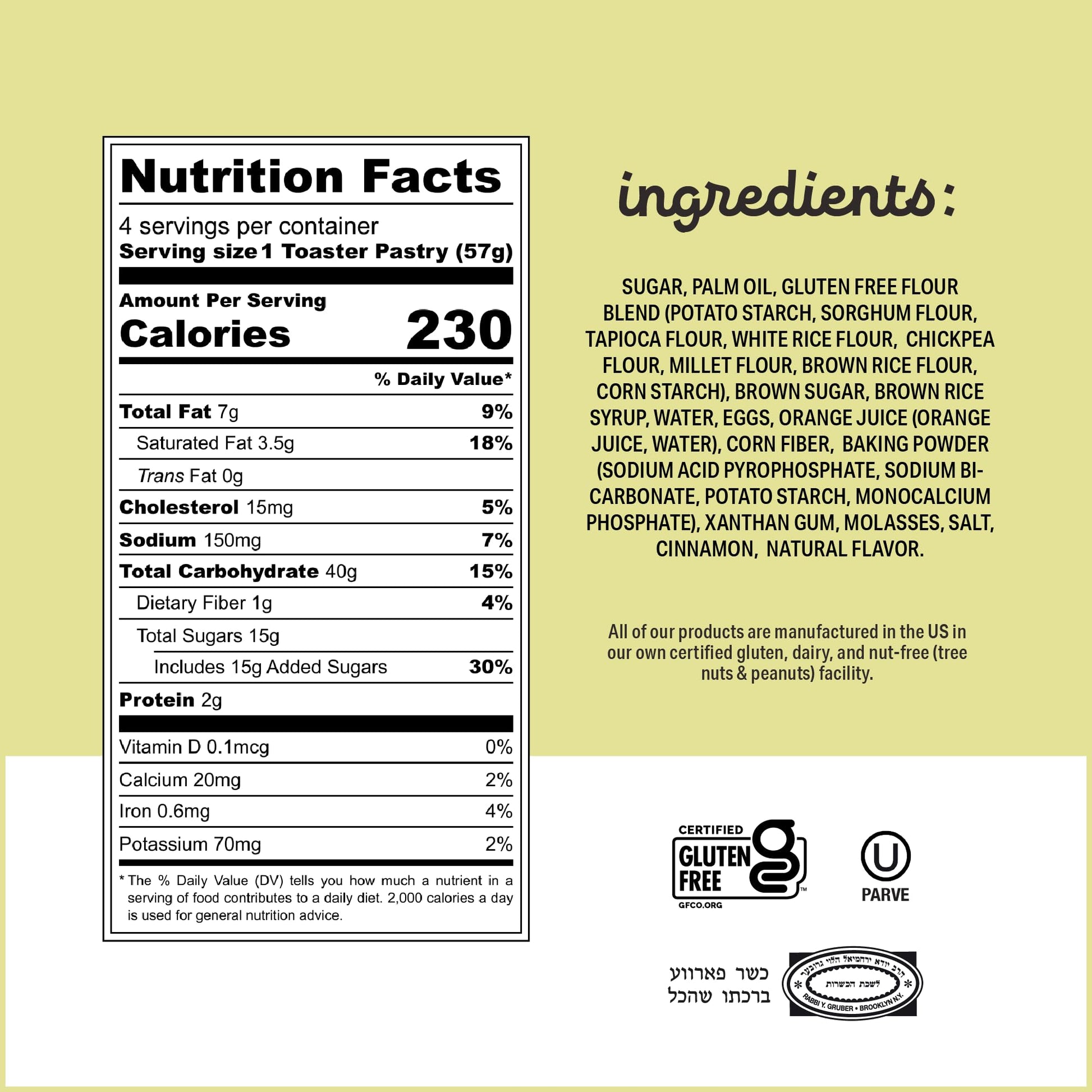 - Q: What flavors are available for Katz Gluten Free Toaster Pastries? A: Currently, Katz Gluten Free offers a variety of flavors, including the Unfrosted Cinnamon flavor. These pastries are crafted to provide a delicious taste without artificial flavors or colors, making them a wholesome snack option.