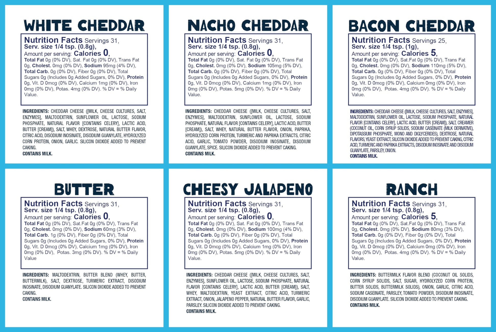 Q: What flavors are included in the Kernel Season's Mini Savory Popcorn Seasoning Variety Pack?A: The Kernel Season's Mini Savory Popcorn Seasoning Variety Pack includes 2 White Cheddar, 2 Nacho Cheddar, 1 Bacon Cheddar, 1 Butter, 1 Cheesy Jalapeno, and 1 Ranch flavor.