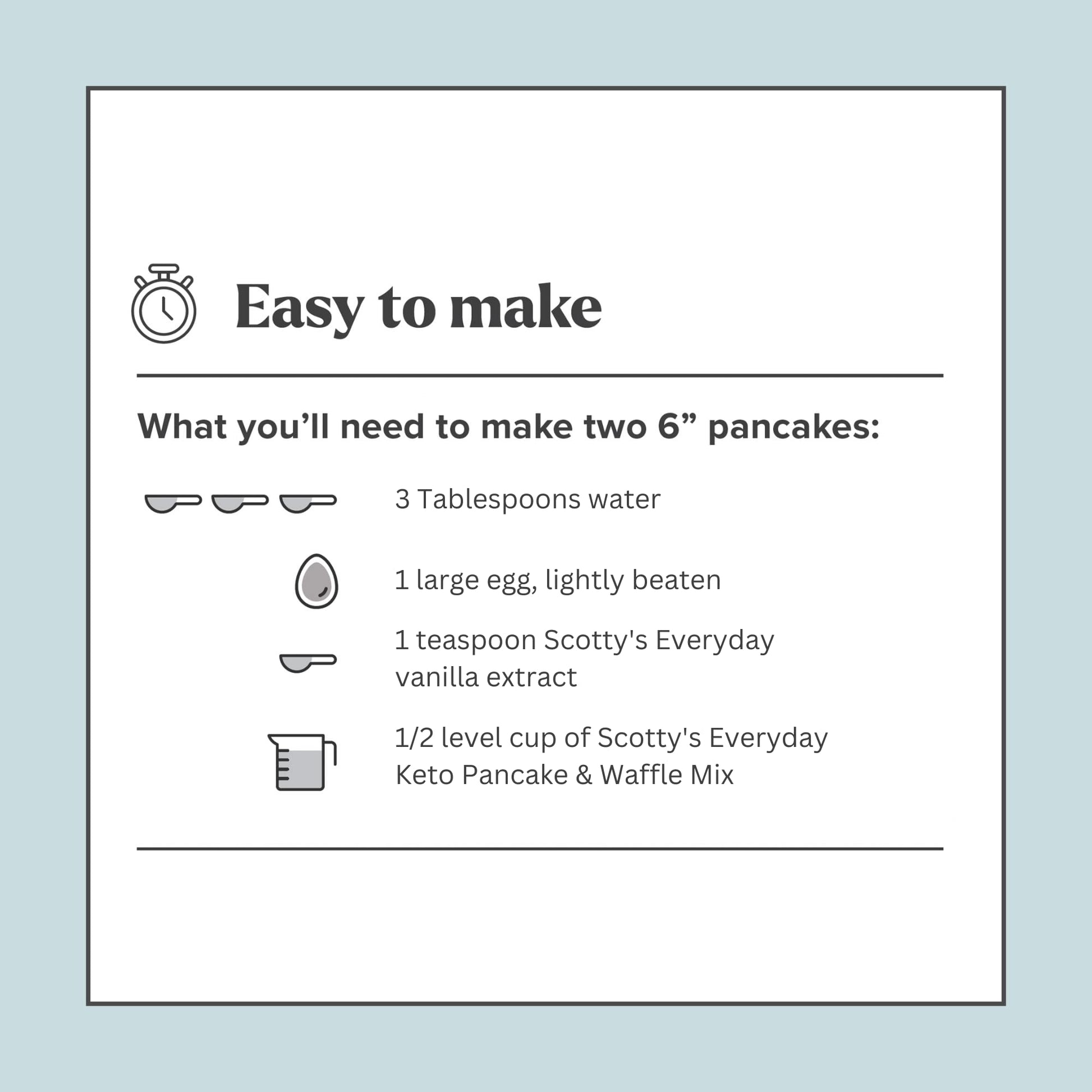 - Q: Is this pancake mix suitable for vegans? A: The Keto Pancake & Waffle Mix is not vegan as it requires an egg for preparation. However, you can experiment with egg substitutes such as flaxseed meal or applesauce to create a vegan version, although the texture may vary.