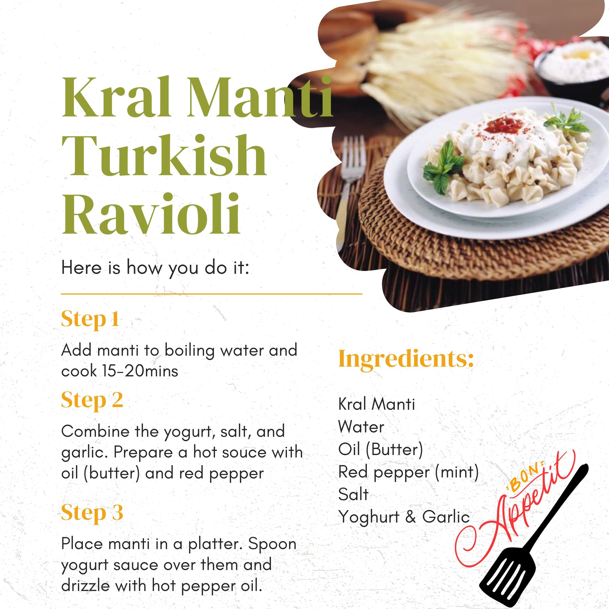- Q: What are Kral Manti and how are they prepared? A: Kral Manti are traditional Turkish stuffed dumplings, also known as Turkish Ravioli. They are made from a dough filled with a mixture of ingredients, including beef mince and spices. To prepare, simply boil them in salted water for 20-25 minutes, then serve with yogurt and a drizzle of hot pepper oil.