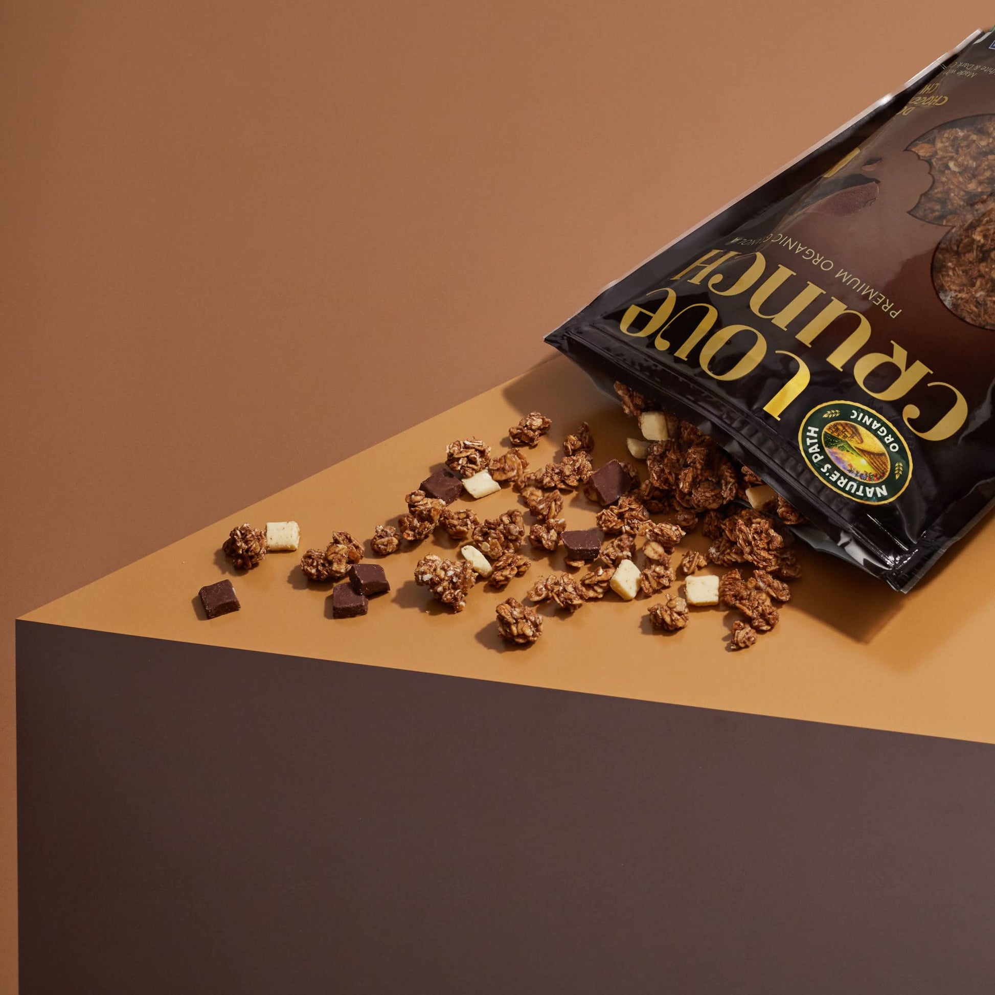 - Q: What are the main ingredients in Love Crunch Organic Double Chocolate Chunk Granola? A: Love Crunch Organic Double Chocolate Chunk Granola primarily includes organic rolled oats, organic cocoa, organic chocolate chunks, and a blend of other wholesome ingredients. This granola is designed for those who enjoy a rich chocolate flavor while maintaining a healthy diet.