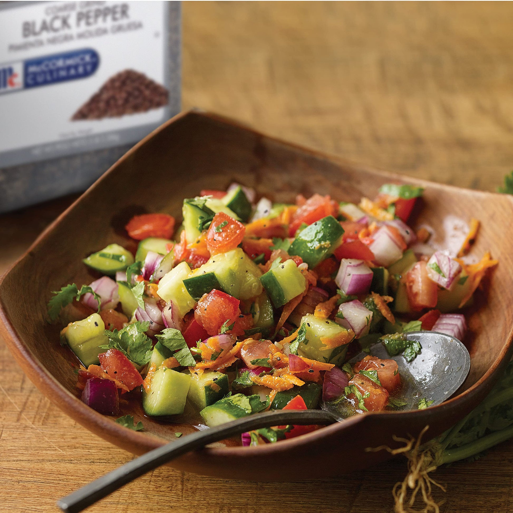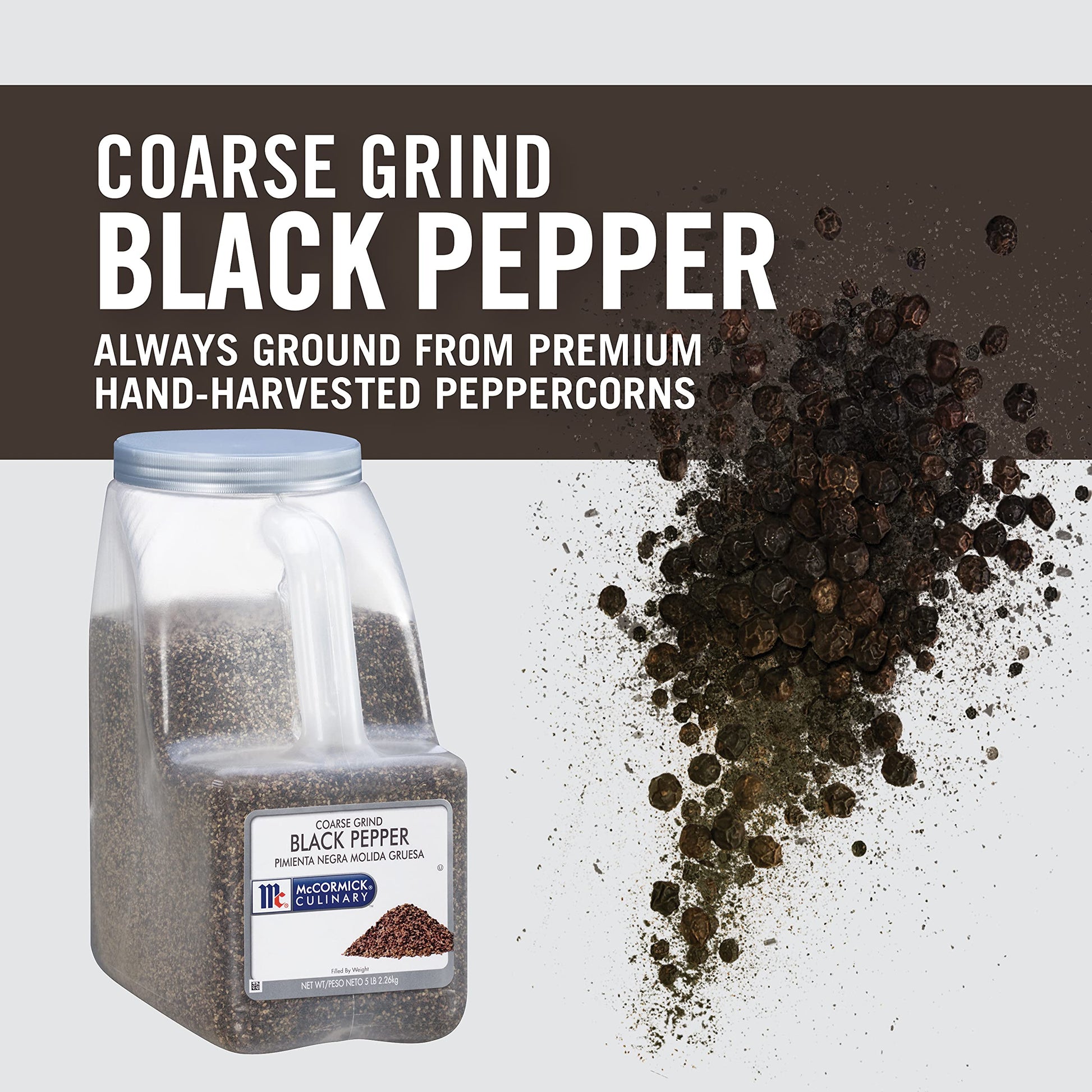 Black pepper is a critical ingredient in practically every meal served at tables around the globe Known as the king of spices, black pepper is undoubtedly on your list of essential condiments at any high-volume establishment Mccormick culinary Black Pepper is coarse ground and has a mesh size of 10 If you prefer a finer texture, you can pour this coarse black pepper in an adjustable-grind type grinder with the mesh size you desire Black peppercorns offer their most robust flavor after they mature or ripen Piperine, a compound found in the peppercorns skin, gives black pepper its signature taste Want more heat from the piperine to shine through Just add more pepper to your recipes Peppercorns give off a wonderfully pungent aroma, as well as complex notes of citrus Take Mccormick culinary coarse grind Black Peppers flavor-enhancing properties to the next level by adding other herbs and spices to your dish For example, while adding coriander may bring out ground peppers citrus notes, adding rosemary can highlight that delicious pine flavor certain berries magnify the woodsy flavors of Mccormicks coarse black pepper, too ground black pepper comes in a 5-pound bulk container with a shaker top and spout, allowing easy dispensing for soups, salads, eggs and steaks If you just want a dash, simply use the shaker option When your recipe calls for more, use measuring spoons to get the right amount Black pepper arrives ready to use with no preparation necessary You can store it between uses when handled properly, even if you dont use the spice daily To extend the products shelf life: (1) Keep the 5-pound container tightly sealed and stored in a cool, dry place (2) Avoid exposing the product to direct sunlight, fluorescent light, heat and humidity to maintain the flavor and color (3) Ensure all measuring spoons and cups you use are dry to avoid introducing moisture to the product