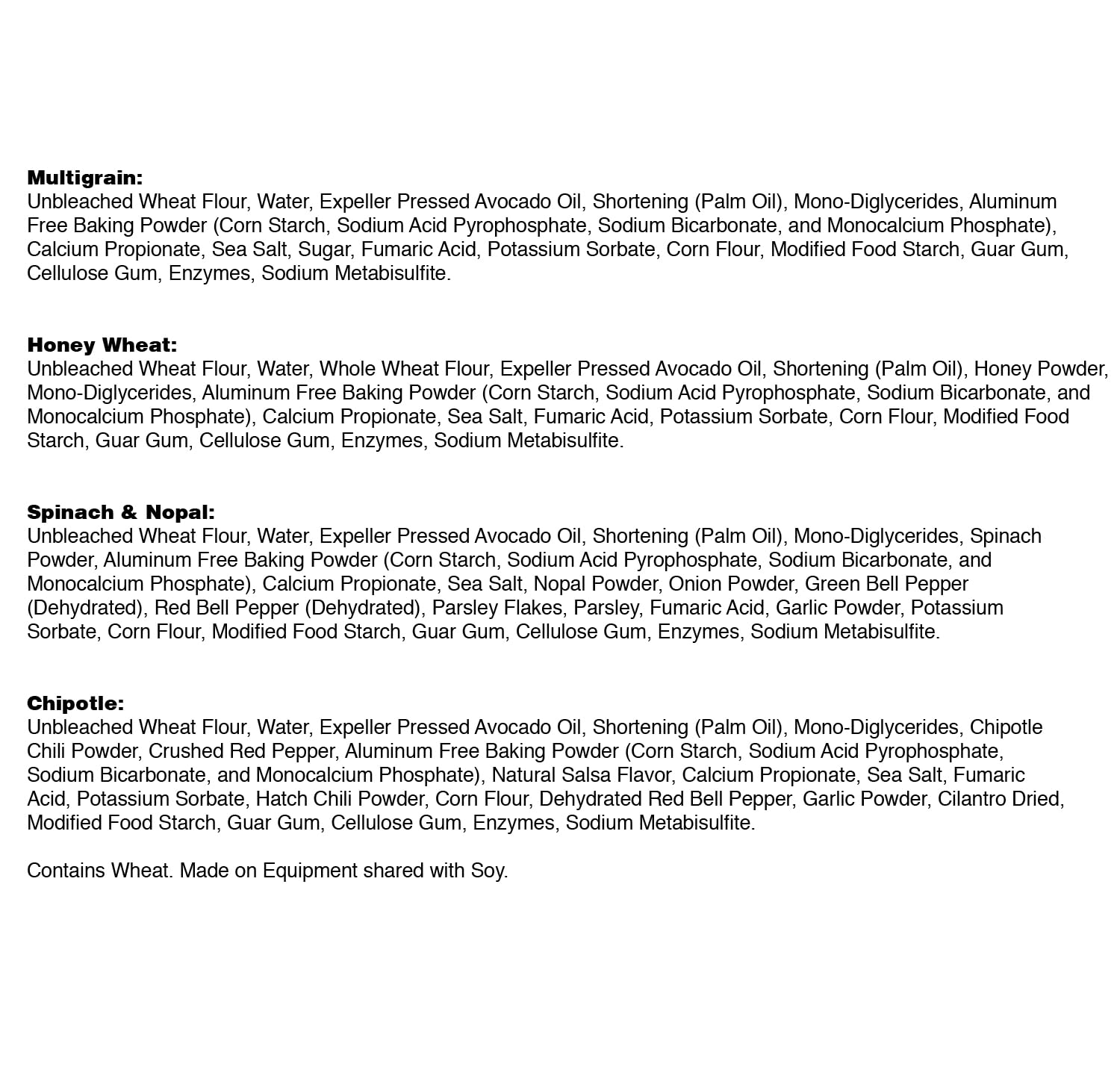 - Q: What flavors are included in the Gourmet Wraps Variety Pack? A: The Gourmet Wraps Variety Pack includes an assortment of flavors: Gourmet White, Honey Wheat, Chipotle, and Spinach & Nopal. This variety ensures that you can enjoy different tastes with each meal.