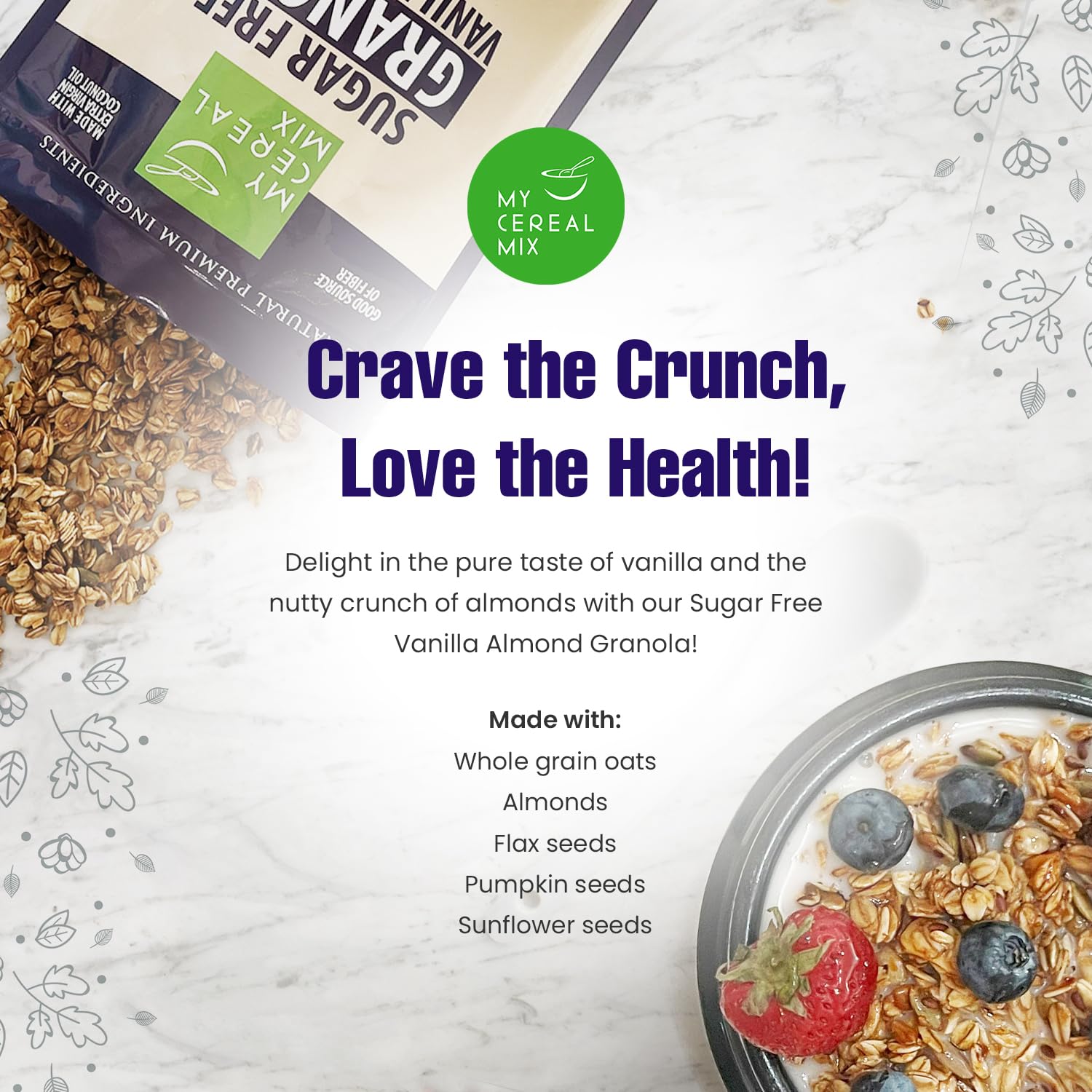 Indulge In Guilt-Free Sweetness With Vanilla Almond Sugar-Free Granola - Deliciously Vegan, Gluten-Free, And Naturally Sweetened. Mycerealmix Vanilla Almond Sugar-Free Granola Combines A Rich, Nutty Flavor With Natural Sweetness For A Healthy And Satisfying Breakfast Or Snack. Each Crunchy Bite Is Packed With Whole Grain Oats, Almonds, And Organic Flax Seeds, Providing A Great Source Of Fiber To Keep You Full And Energized Throughout The Day. Free From Sugar, This Granola Is Sweetened With Allulose And Monk Fruit Extract, Which Are Virtually Calorie-Free And Diabetic-Friendly. This Makes It Ideal For Anyone Seeking To Reduce Sugar Intake Without Compromising On Taste. Plus, With No Sodium, Soy, Gmos, Or Artificial Sweeteners, Its A Clean And Nourishing Choice For A Balanced Lifestyle. Crave The Crunch, Love The Health!