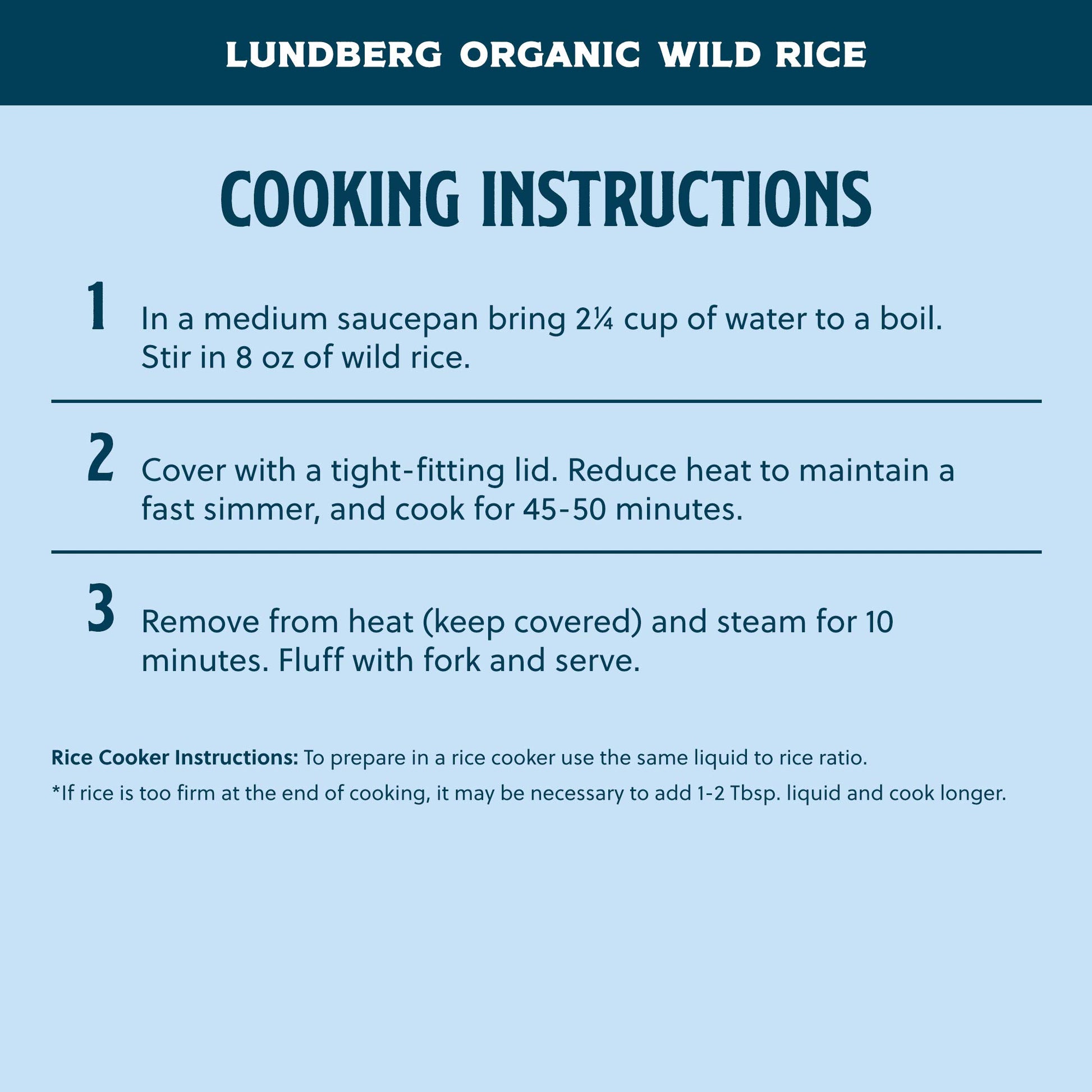 - Q: How can I cook Lundberg Organic Wild Rice? A: To cook Lundberg Organic Wild Rice, rinse the rice under cold water, then combine it with water in a pot at a ratio of 1 cup of rice to 3 cups of water. Bring to a boil, then reduce heat and simmer for about 45-60 minutes until the rice is tender and has absorbed the water.