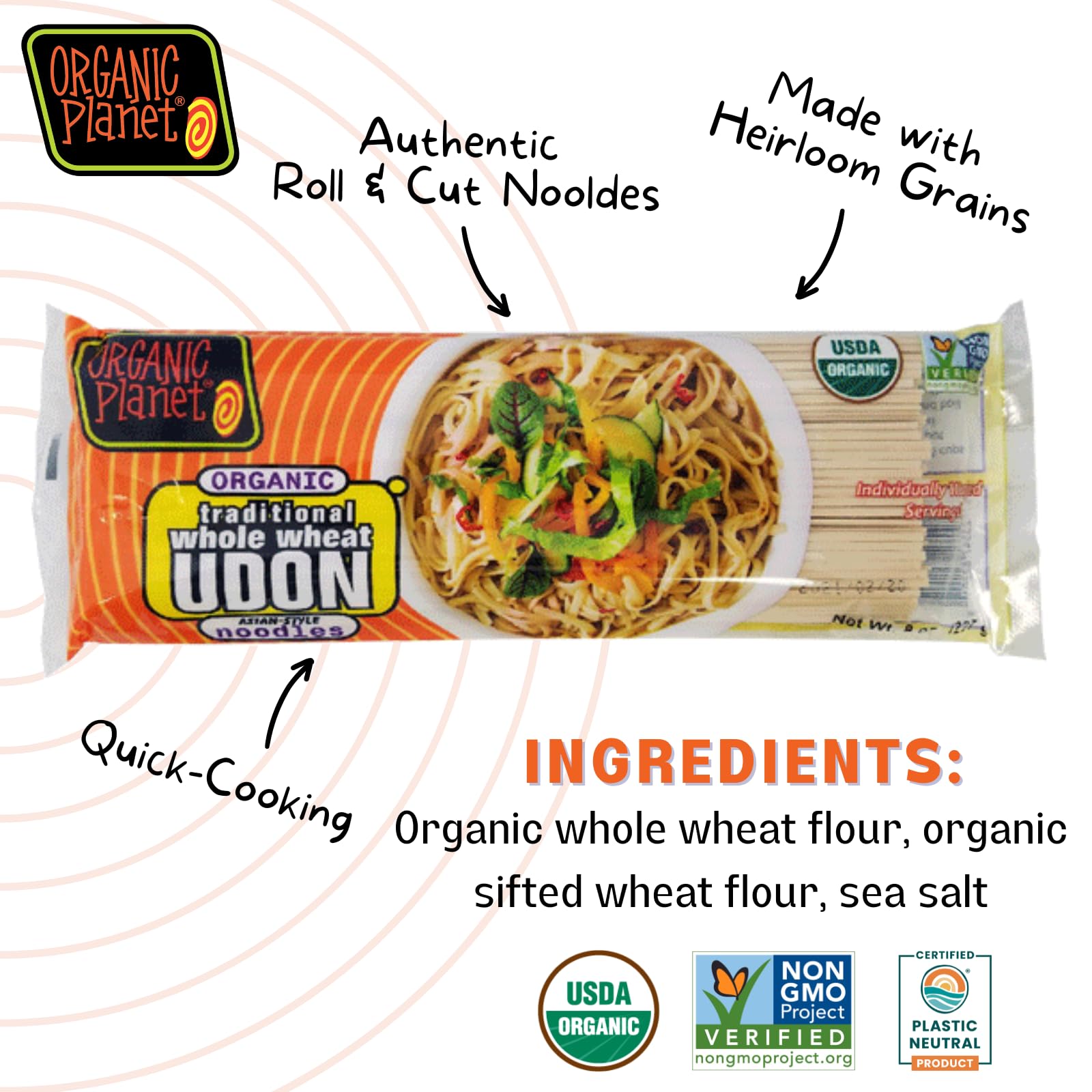Q: What are the main ingredients in Organic Planet Whole Wheat Udon?A: Organic Planet Whole Wheat Udon is made from heirloom grains and is USDA certified organic, non-GMO, and vegan. It contains no egg, chemical additives, or genetically modified ingredients.