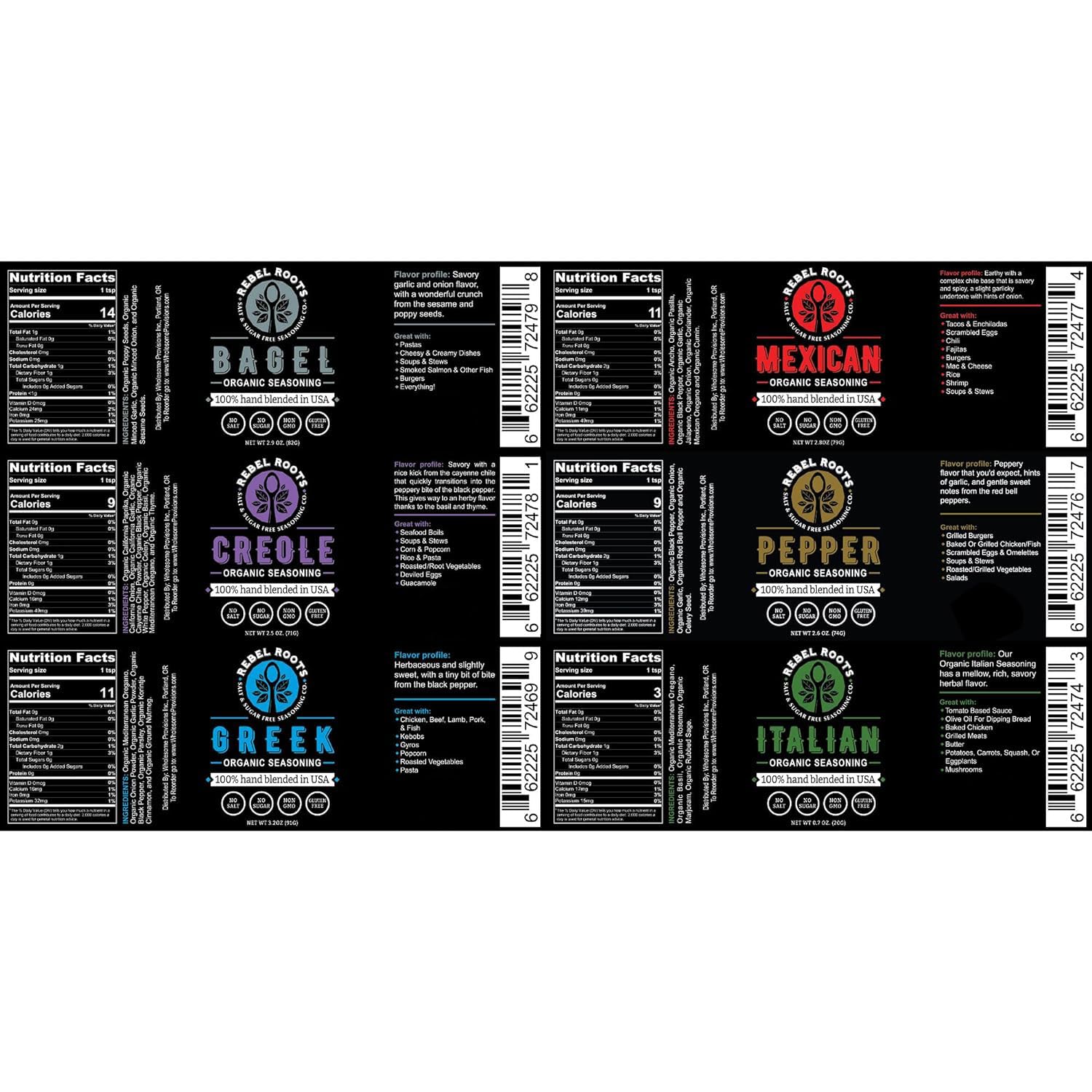 Rebel Roots Is A Salt And Sugar Free Seasoning Company. All Of Our Seasoning Blends Are Organic And Is Non-Gmo Certified. Our Seasoning Contain No Gluten, No Anti-Caking Agent, No Artificial Coloring, No Artificial Flavorings Or Extracts, And No Preservatives! 100% Made And Hand Blended In Usa. Wholesome Provisions Is An Exclusive Distributor Of Rebel Roots.