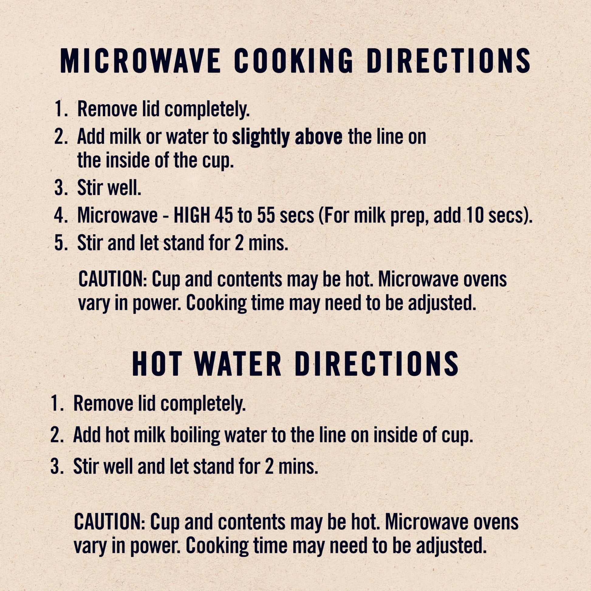 - Ready in 45-50 seconds; just add water or milk.