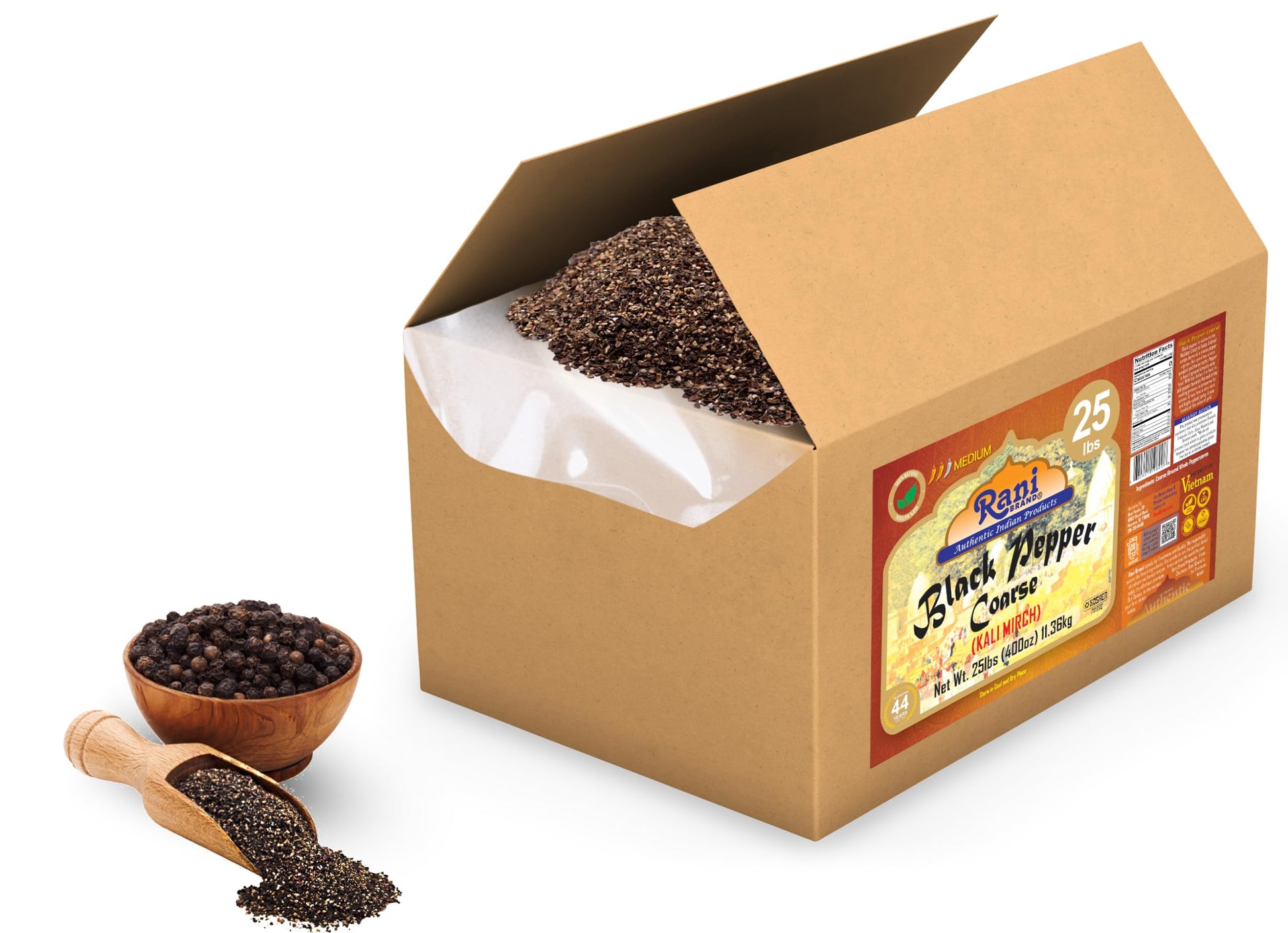 Q: Is Rani Black Pepper packaged in a way that preserves its freshness?A: Yes, Rani Black Pepper is packaged in a no barrier bulk carton box, which is important for maintaining the potency and freshness of this gourmet spice.