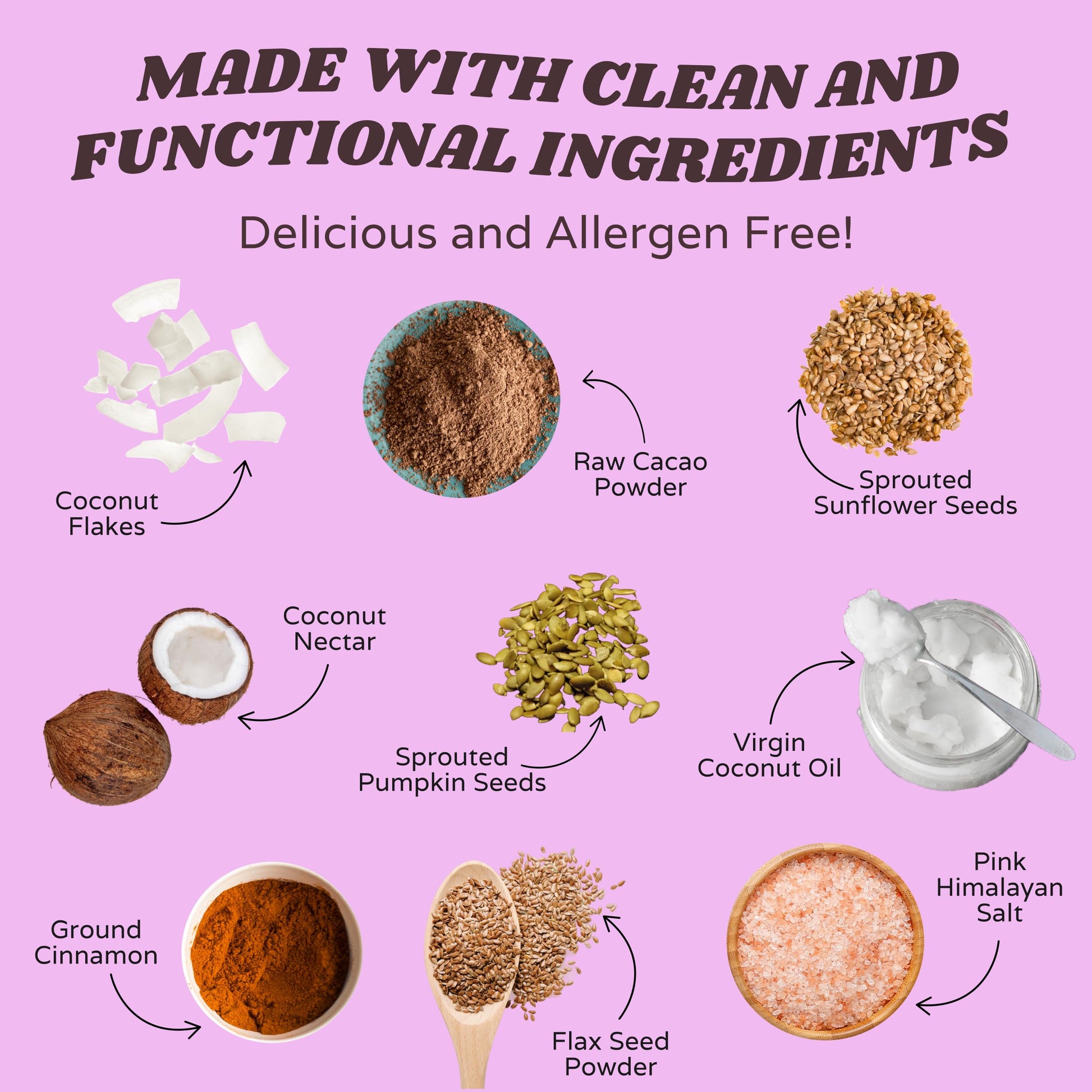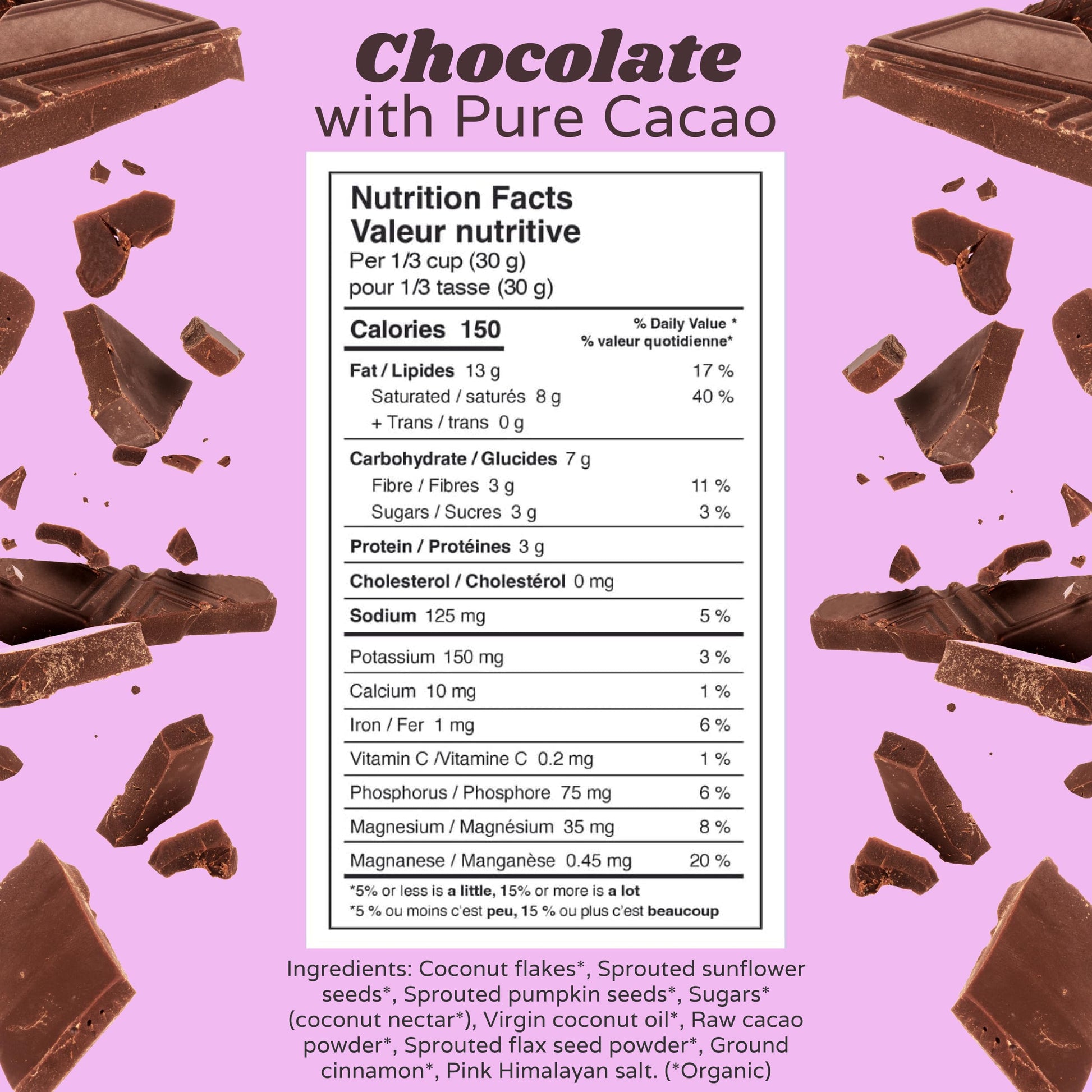 - Q: What are the main ingredients in the Chocolate with Raw Cacao Granola? A: The main ingredients include chocolate coconut flakes, sprouted sunflower seeds, sprouted pumpkin seeds, and raw cacao. It is lightly sweetened with coconut nectar, ensuring it has only 3 grams of natural sugar per serving.