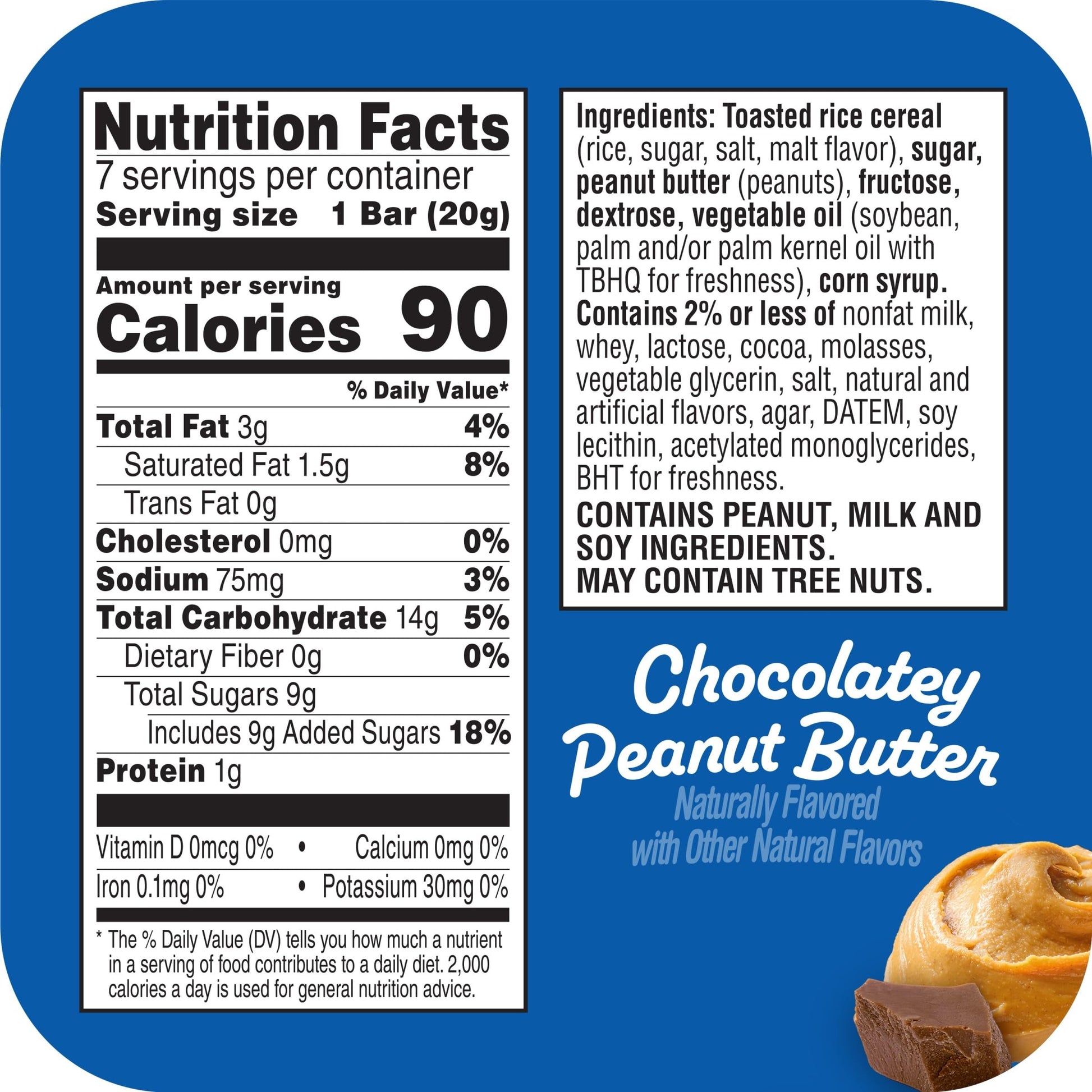 Q: How many calories are in each Rice Krispies Treat?A: Each Rice Krispies Treat Chocolatey Peanut Butter bar contains 90 calories, making them a tasty yet satisfying snack option.