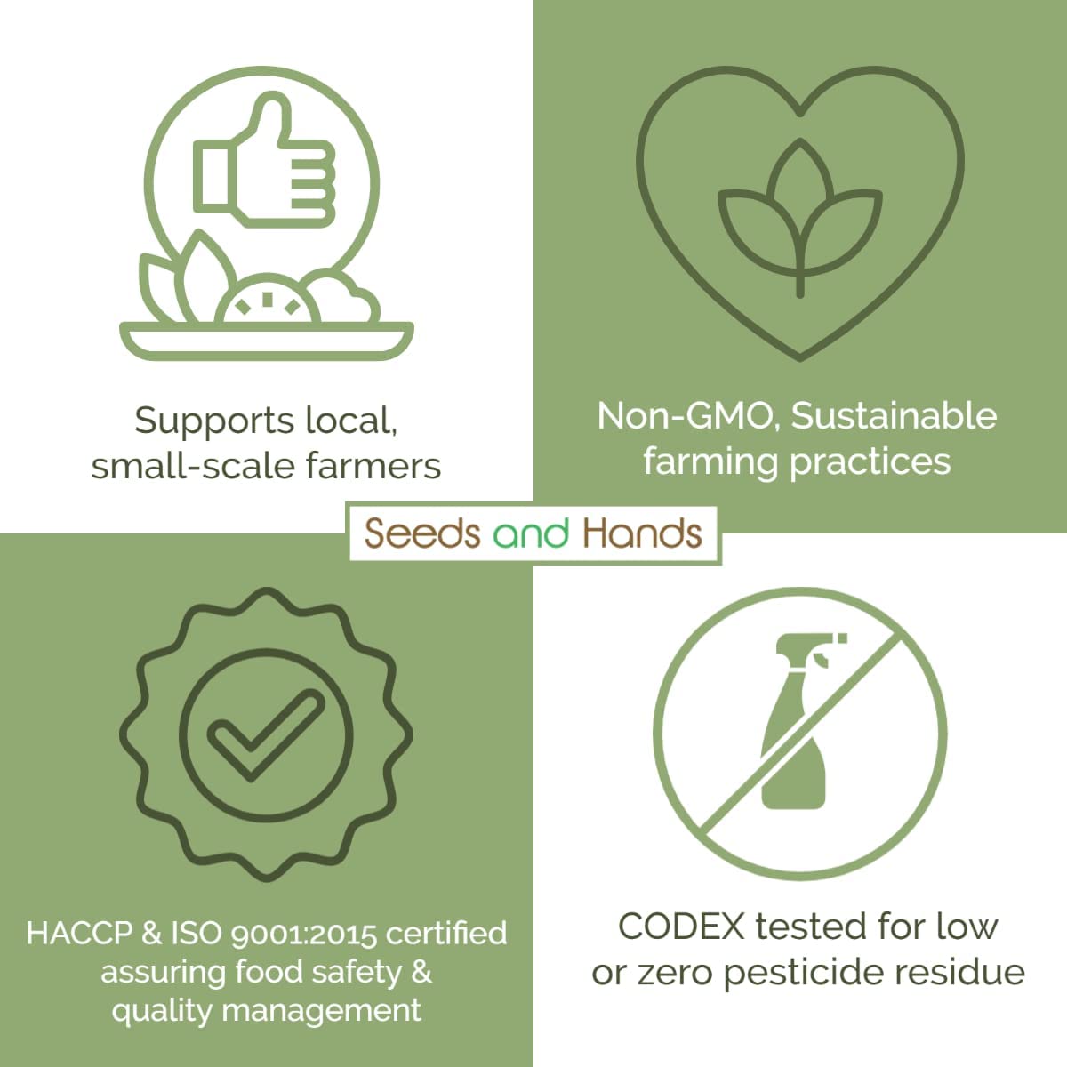 - Q: Is this black pepper organic and free from pesticides? A: Yes, the Seeds and Hands Tellicherry Black Pepper follows internationally accepted food standards, including CODEX testing to ensure low or no pesticide residue. This commitment to food safety and quality management allows you to enjoy the pepper with peace of mind.