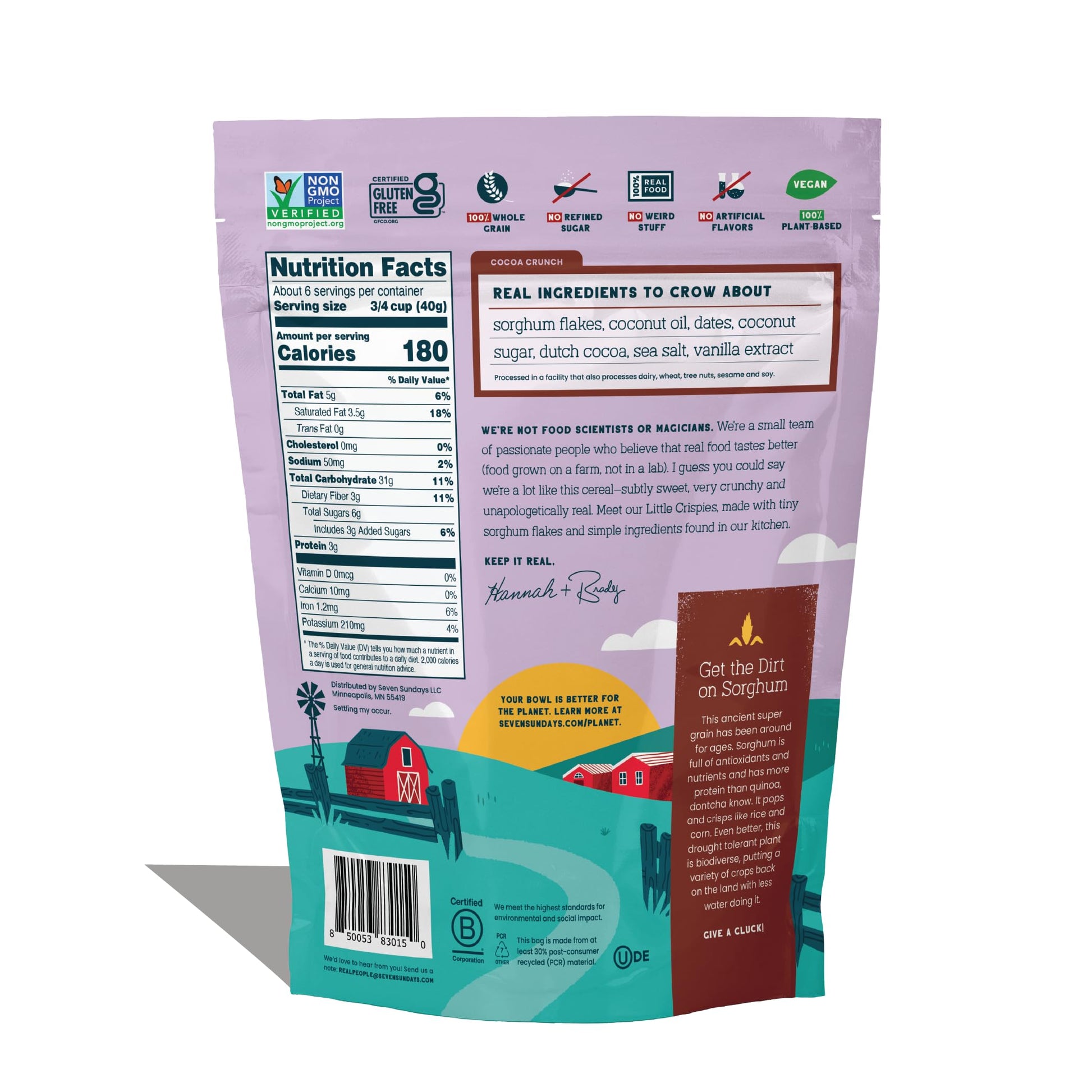 - Q: What are the main ingredients in Seven Sundays Little Crispies? A: Seven Sundays Little Crispies are made with whole food ingredients including plant-based protein sources, and do not contain sugar alcohols, artificial flavors, or fillers. The cereal is designed to provide a clean, nutritious alternative to conventional cereals.