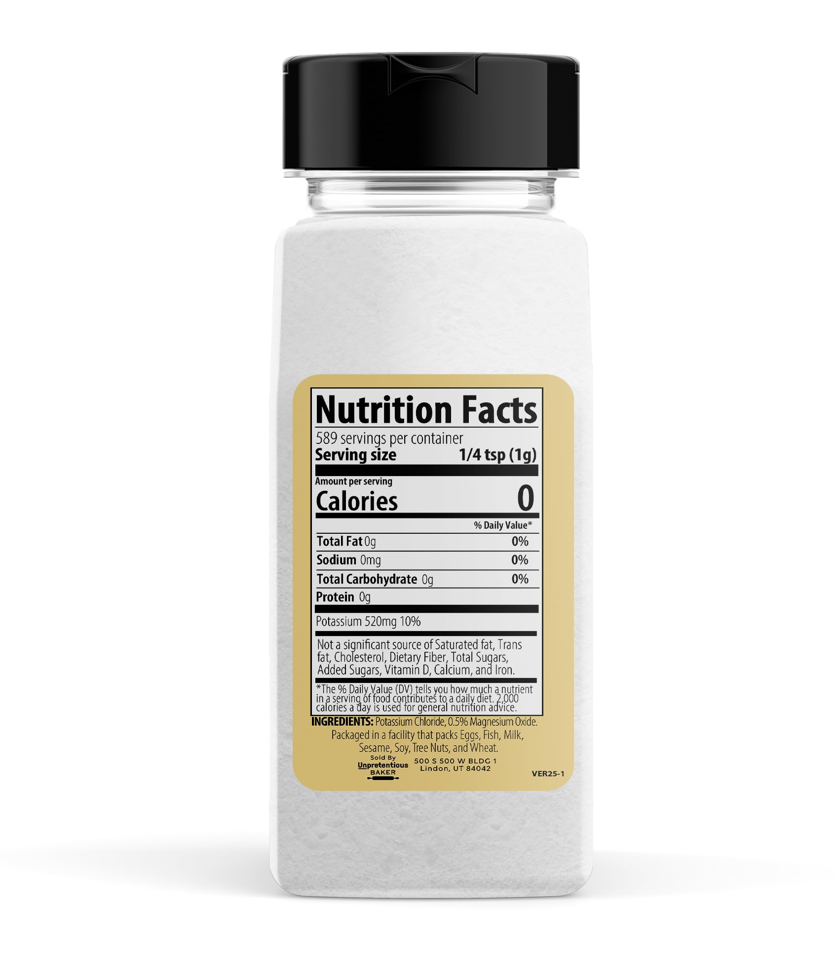Q: What is the main ingredient in the Unpretentious No Sodium Salt Substitute?A: The primary ingredient in the Unpretentious No Sodium Salt Substitute is potassium chloride, which provides a salty taste without the sodium.