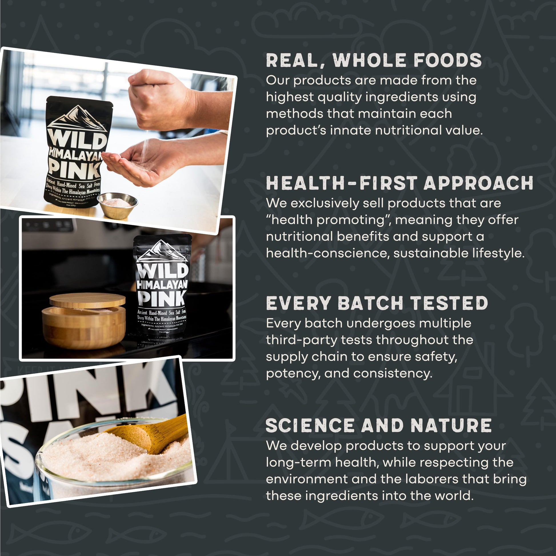 - Q: What makes Wild Himalayan Pink Salt different from regular table salt? A: Wild Himalayan Pink Salt is 100% natural and hand-mined, containing over 80 trace minerals and electrolytes, which contribute to its distinct pink color and superior flavor. Unlike regular table salt, which is processed and often contains additives, Wild Pink Salt is untouched by man and retains its natural purity.