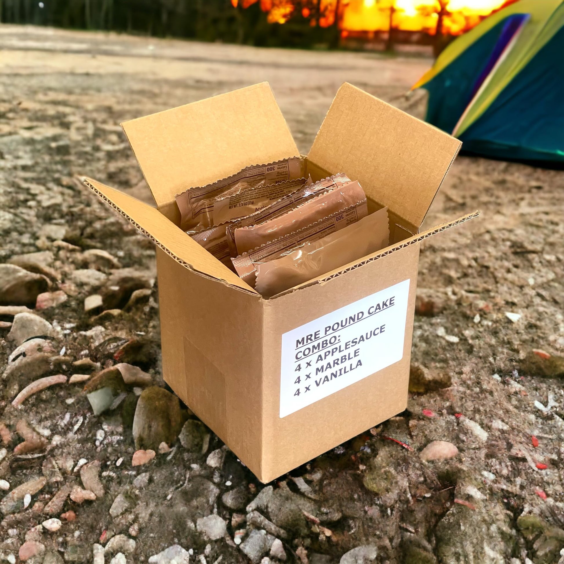 - Q: What flavors are included in the MRE Pound Cake Combo? A: The MRE Pound Cake Combo includes four Marble Pound Cakes, four Vanilla Pound Cakes, and four Applesauce Pound Cakes, all individually packed.