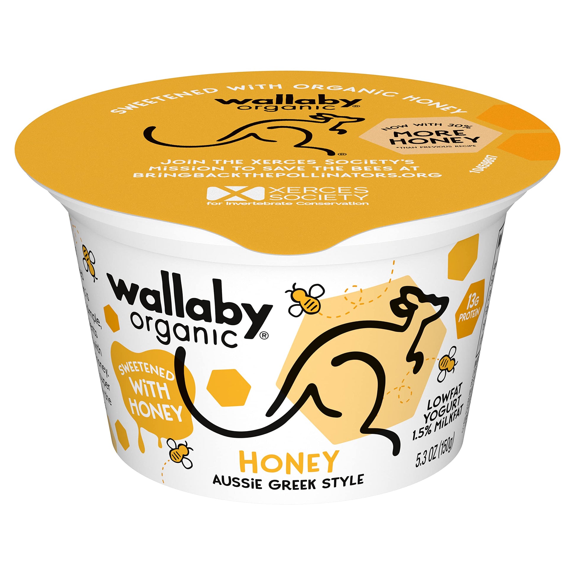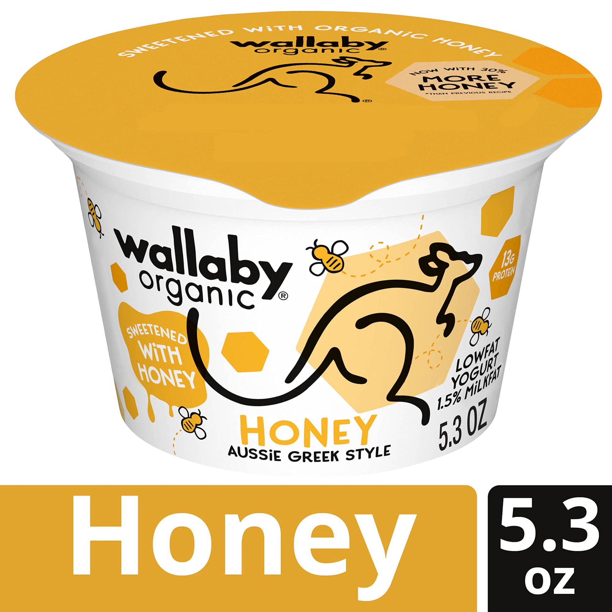- Q: What makes Wallaby Organic Aussie Greek Honey Low Fat Yogurt different from regular yogurt? A: Wallaby Organic Aussie Greek Honey Low Fat Yogurt is unique because it is slow-crafted, resulting in an exceptionally creamy texture that is not overly tart. Additionally, it is sweetened with organic honey, providing a delicious flavor while still being low in fat.