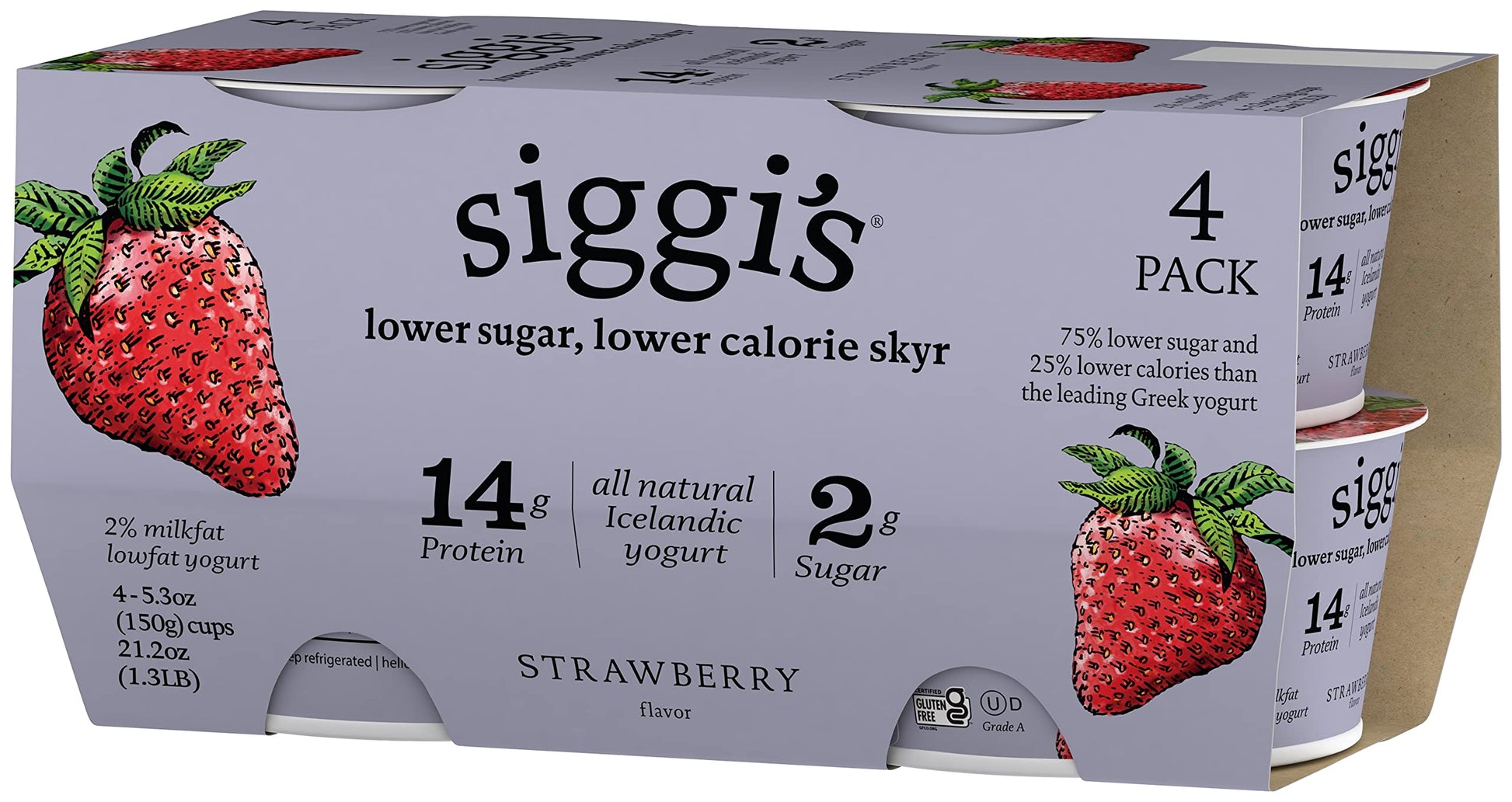 - Q: How many servings are included in the Siggi's Lower Sugar Strawberry Yogurt pack? A: The Siggi's Lower Sugar Strawberry Yogurt pack includes four single-serve cups, each containing 5.3 ounces of yogurt. This multi-pack is perfect for convenient snacking or as a quick breakfast option.