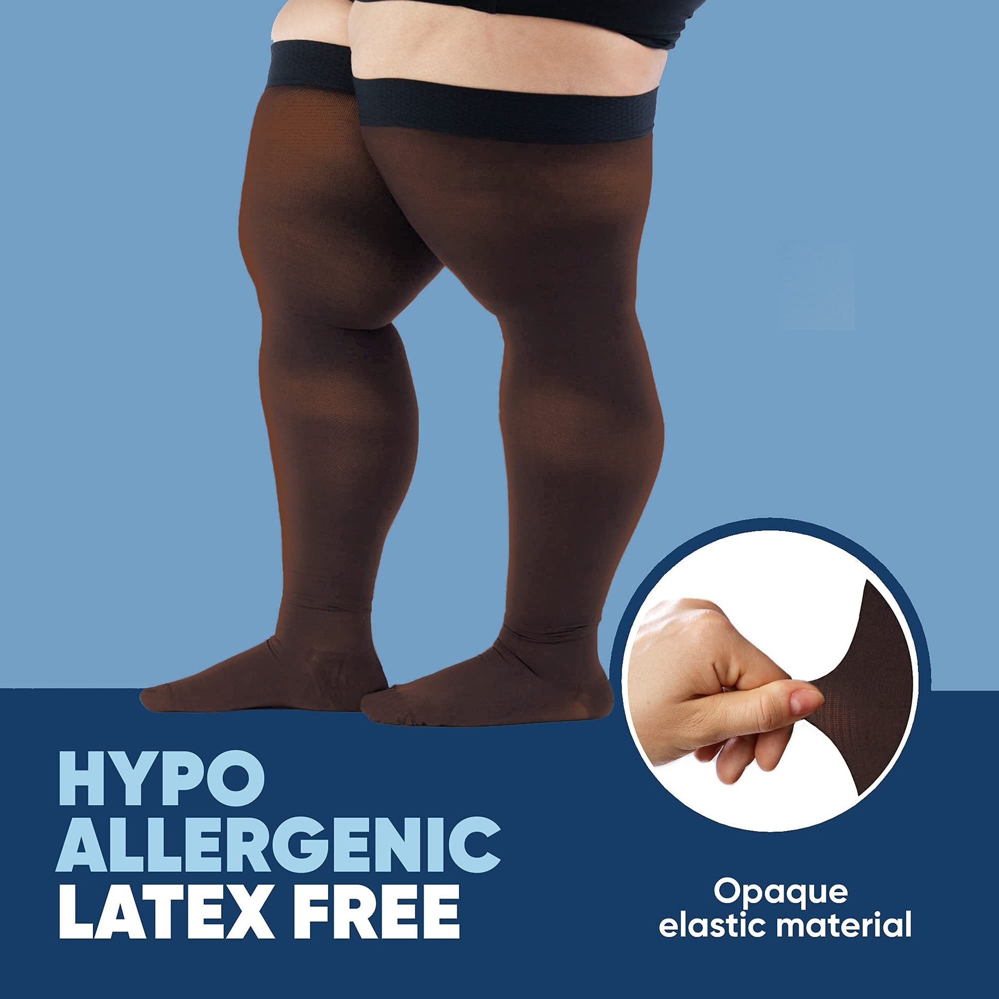 Q: What is the compression level of the 7XL Plus Size Compression Thigh Hi Socks?A: The 7XL Plus Size Compression Thigh Hi Socks provide 20-30 mmHg of graduated compression, which is designed to improve circulation and reduce leg fatigue.