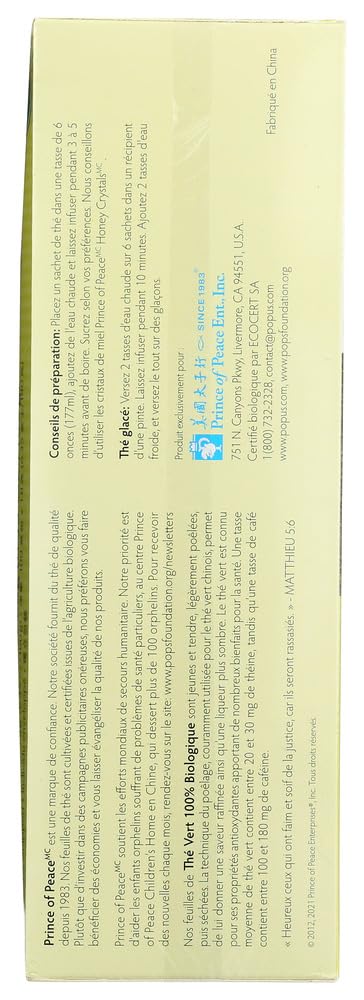 Prince of Peace Organic Green Tea. Description: 100% USDA organic. Green Tea has been known for thousands of years to offer a large number of health benefits. Our young tender 100% organic green tea is freshly harvested; the leaves are then gently washed, steamed, rolled and dried to retain their delicate flavor and aroma. Green tea is known for its antioxidant properties which can aid in combating free radicals that can cause cell damage. Recent scientific research has investigated green tea's benefits toward maintaining cardiovascular health, strong immunity and proper cellular tissue growth. Disclaimer These statements have not been evaluated by the FDA. These products are not intended to diagnose, treat, cure, or prevent any disease.